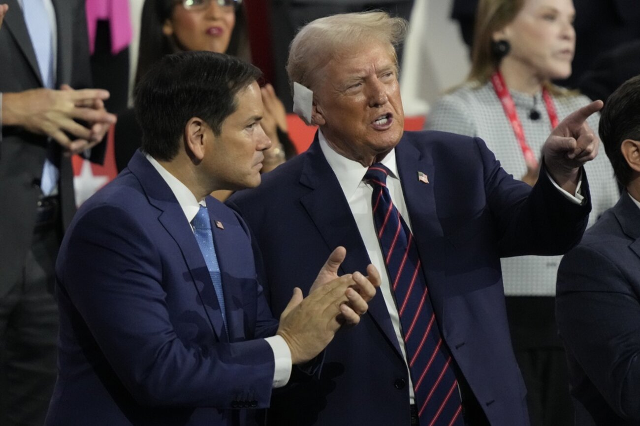 Republican presidential candidate former President Donald Trump talks to Sen. Marco Rubio during the Republican National Convention Wednesday, July 17, 2024, in Milwaukee. (AP Photo/Charles Rex Arbogast)