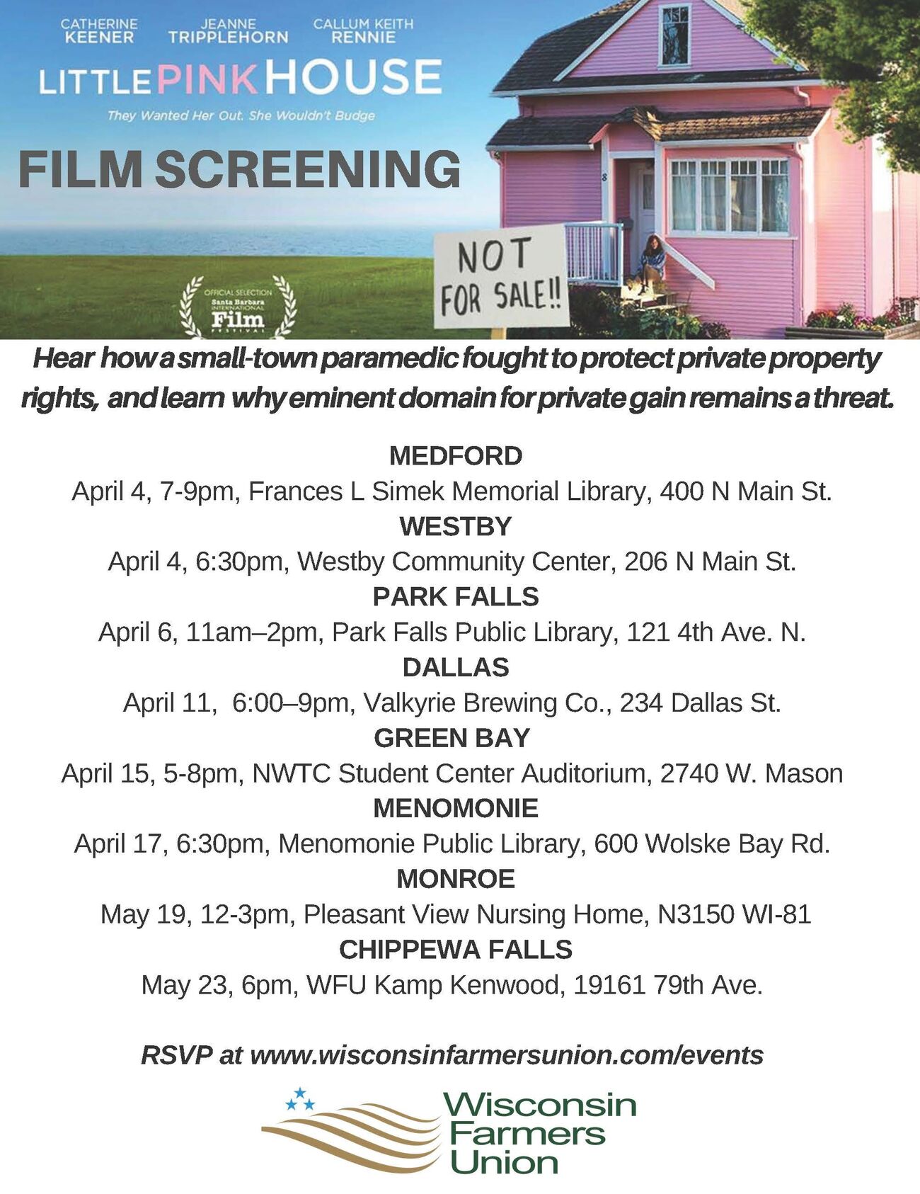 CHIPPEWA FALLS – This spring, Farmers Union chapters across Wisconsin will host film screenings of the “Little Pink House” to raise awareness about the threat of eminent domain for private gain. The film is based on the true story of small-town paramedic Susette Kelo’s fight to save her blue-collar neighborhood from being bulldozed by the pharmaceutical giant Pfizer. Kelo emerged as the reluctant leader of her neighbors in a battle that went all the way to the Supreme Court and inspired a nation.