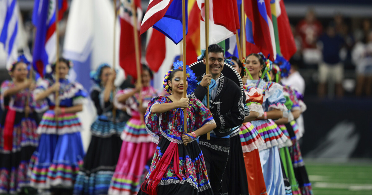 A folklorico dance group performs at haltfime of an NFL football game between the Baltimore Ravens and Dallas Cowboys in Arlington, Texas, Sunday, Sept. 22, 2024. (AP Photo/Jeffrey McWhorter)