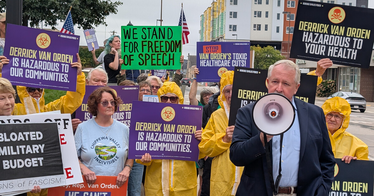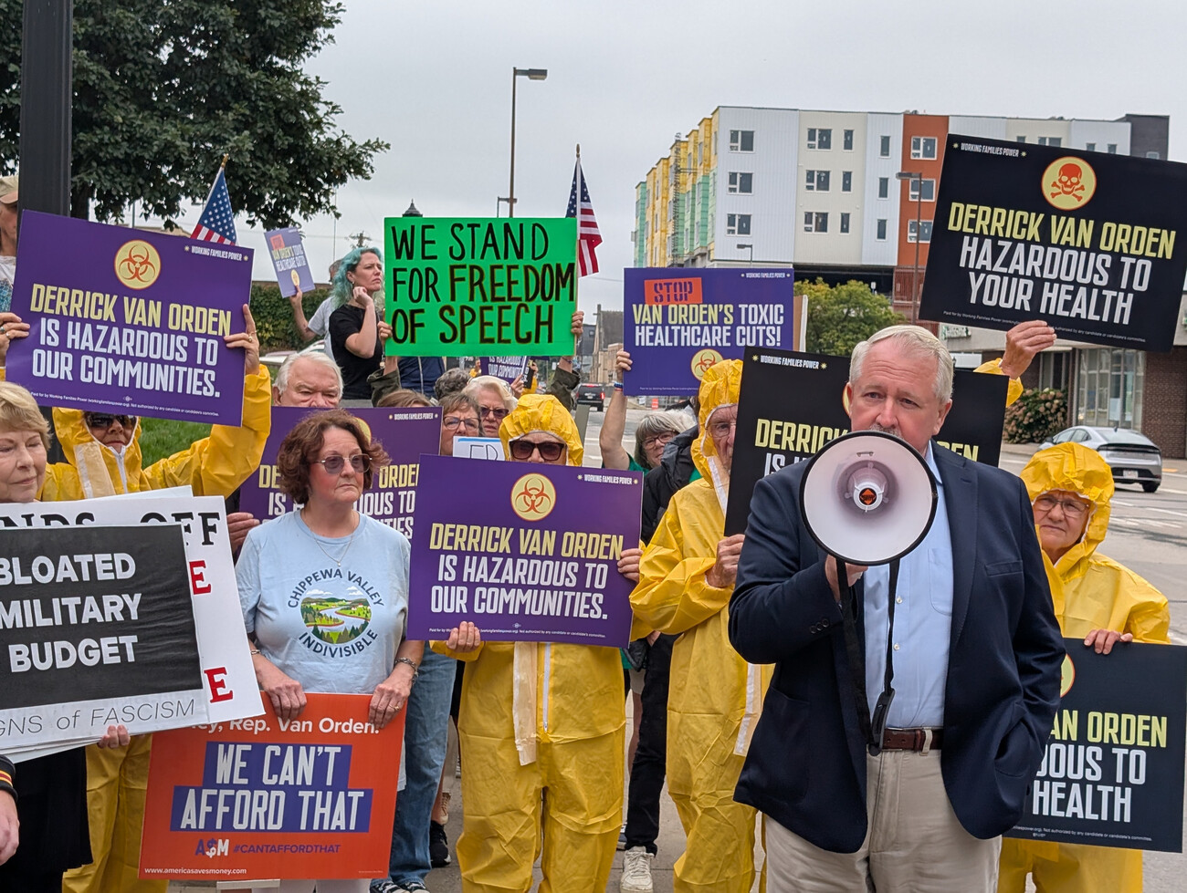 Many of the protesters at the event wore hazmat suits because Van Orden is "toxic" to Wisconsin. The group marched on Farwell St. and chanted their protests against Van Orden's attempts to limit free speech.