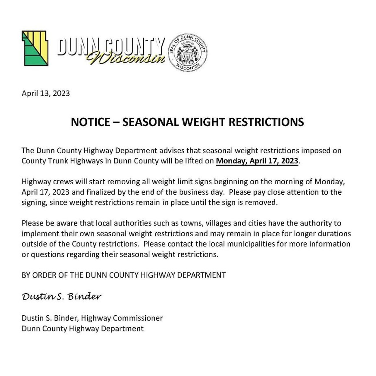 The Dunn County Highway Department has announced that the seasonal weight restrictions on county roads will be lifted on Monday, April 17. On Monday road crews will begin removing the signs from all county roads that control the seasonal weight limits. Note that townships and other municipal governments may have different limits on road weights.