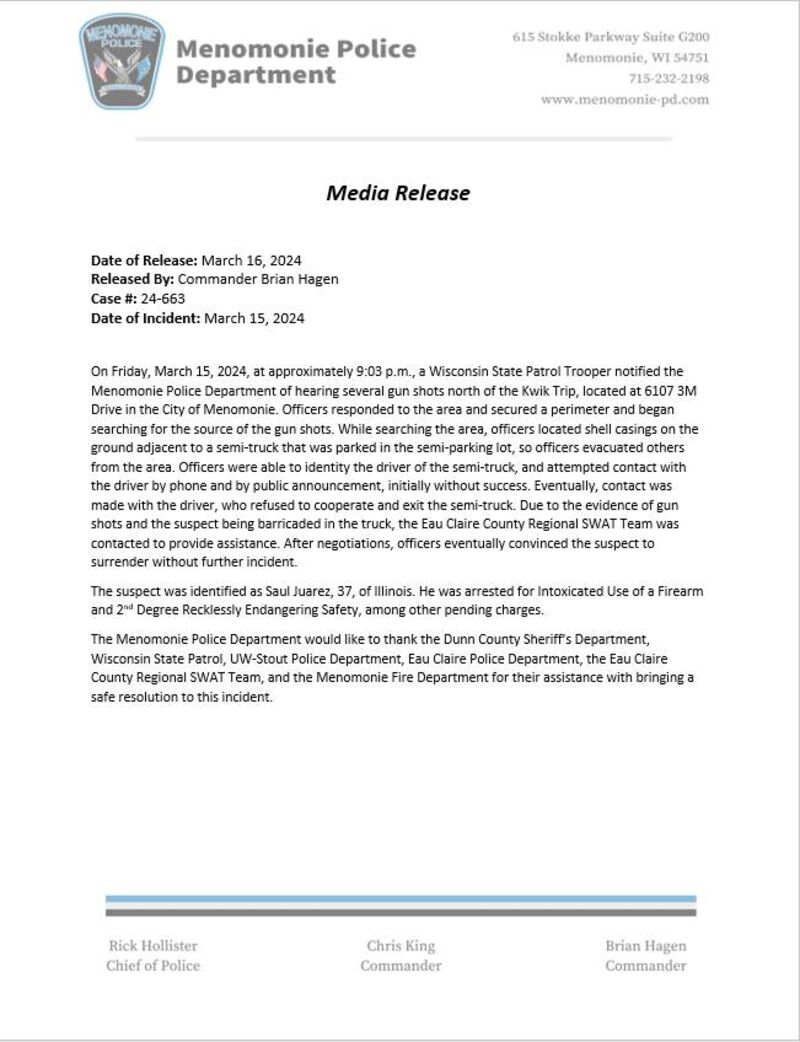At 9:03 PM on Friday, March 15, Menomonie Police responded to an issue at the Kwik Trip at 3M drive in Menomonie about shots being fired. The police secured the area and looked for the source of the gunfire. They located shell casings near a semi in the parking lot and evacuated the area.
