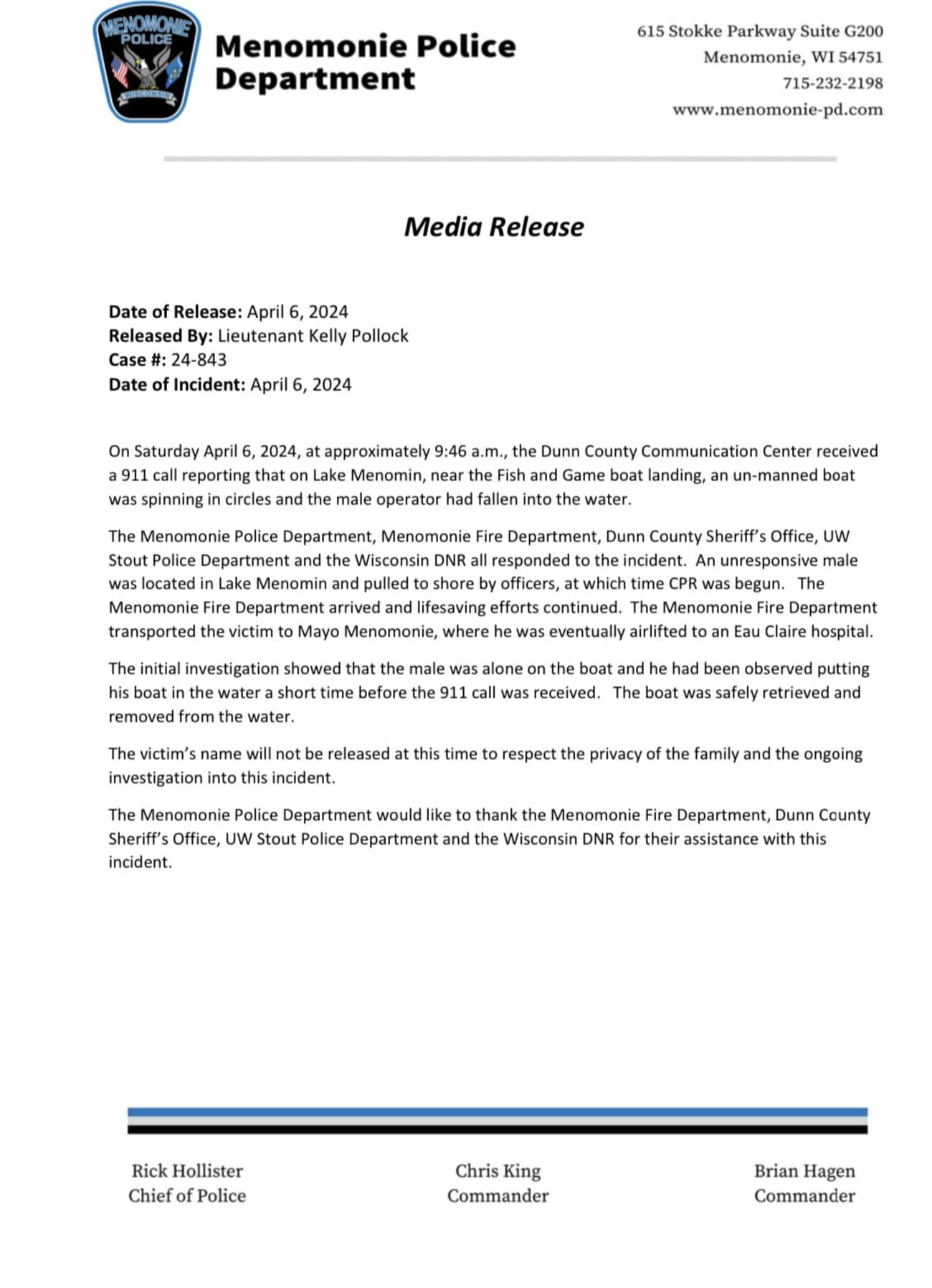 According to a press release this morning, the Menomonie Police Department responded to a call at approximately 9:46 AM on April 6 2024 about an un-manned boat going in circles on Lake Menomin. The report was near the Fish and Game boat landing, and the operator had fallen into the water.
