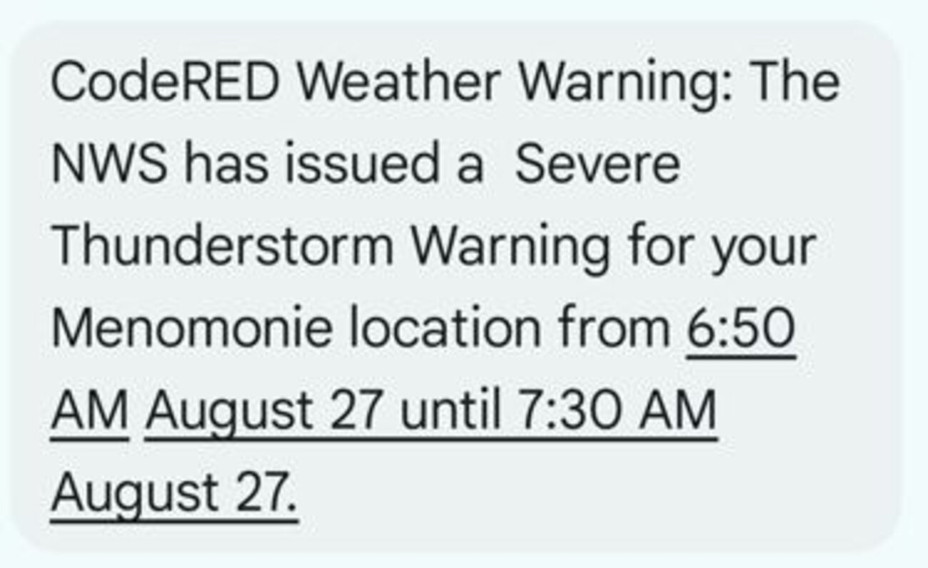 Did you get the CodeRED weather alerts during our recent weather events? If not, perhaps you haven’t opted in to receive them. Weather alerts, directly from the National Weather Service, can be sent directly to your phone and email. Alerts are immediately sent upon being issued by the NWS and appear as shown below.