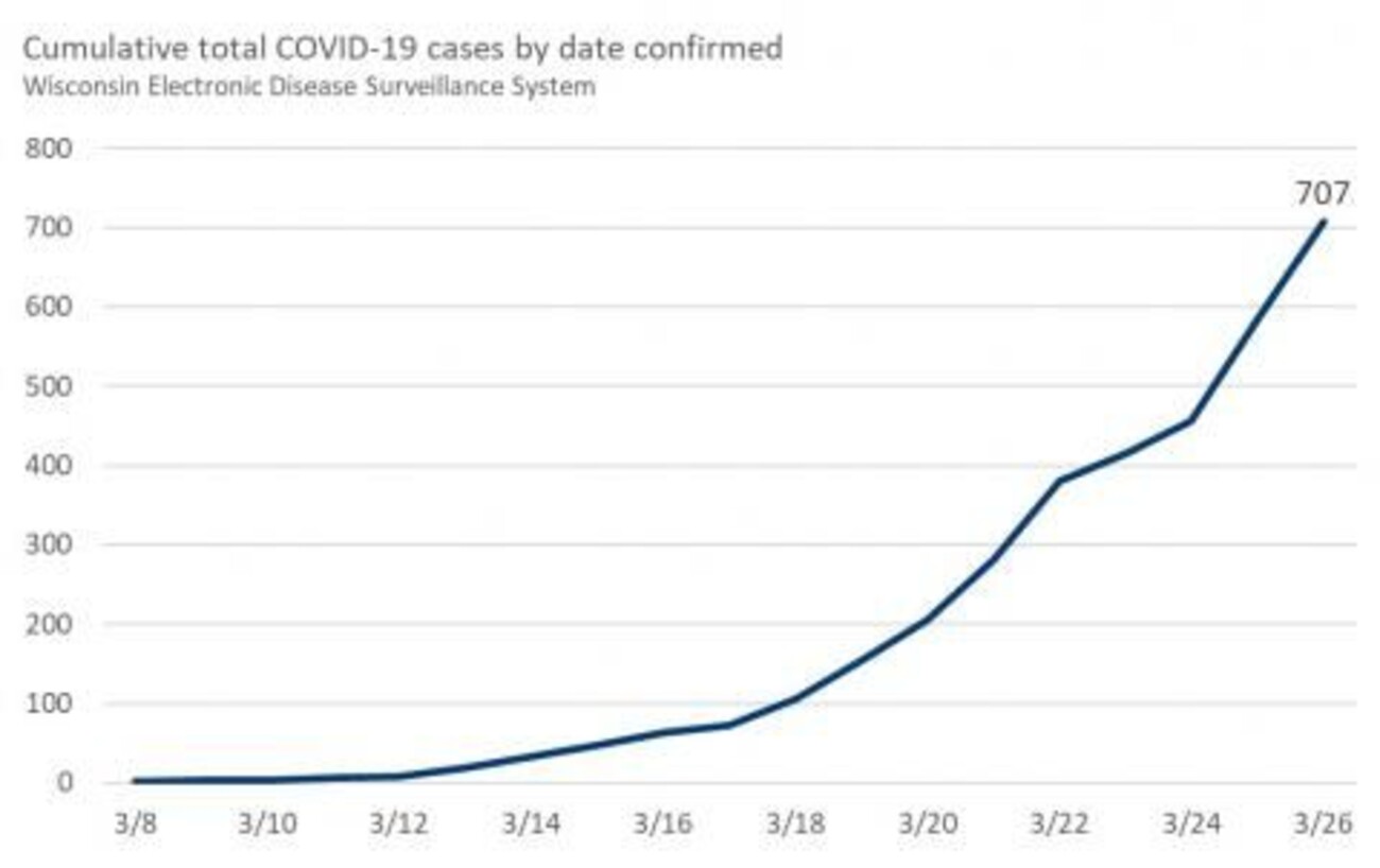 Today's Wisconsin COVID-19 cases are now up to 842, an increase of 135 since yesterday. There are now 13 reported deaths in the state, up from eight reported yesterday. 13,140 negative tests were reported. The new deaths are almost all among African-American patients in Milwaukee.