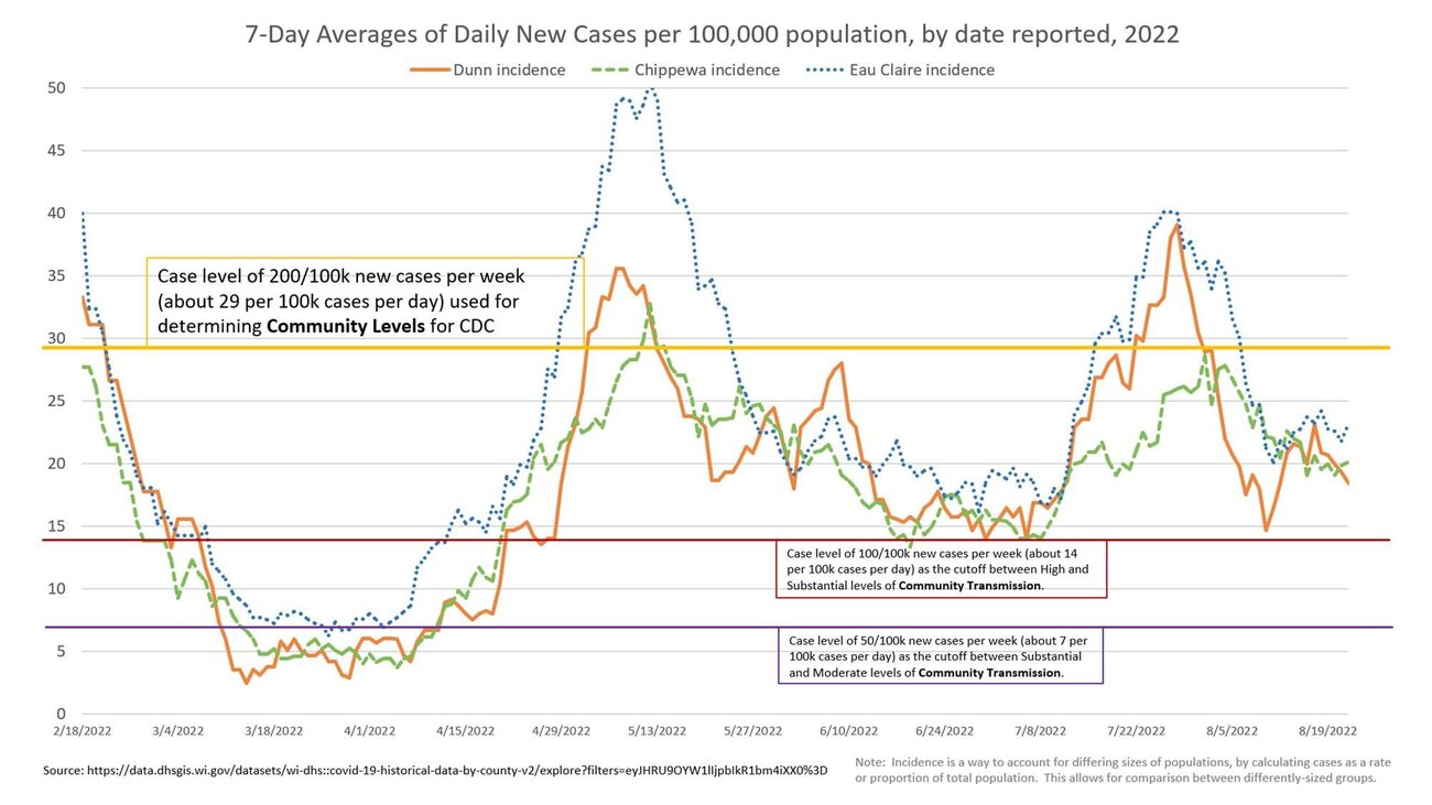 Weekly update for Dunn County - we're back to yellow (as expected) but things are stable. As expected, our Community Level has gone back up to Yellow/Medium. Last week's green status was mostly due to the vagaries of how CDC times their weekly stats and how that lined up with when people were hospitalized. Overall, hospitalizations are slightly up for the region, in part likely due to a higher than typical case rate in people aged 70+, who are at highest risk for hospitalization. We shall have to watch and see if that comes back down. Overall, transmission is still high, so the same advice applies - there's a lot of COVID going around, so if you want to avoid the risk of getting it, masking in crowded, indoor locations and taking other measures makes sense. Remember, too, if you are age 65+ or at higher risk for complications due to medical problems and you test positive for COVID, contact your medical provider to ask if Paxlovid would be right for you.Nationally and state-wide, the BA.5 wave seems to have peaked in most places. It will be interesting to see what happens in the next several weeks, with schools restarting. We may get a second surge, or, if enough people have already been infected this go-round, we may not. I'm anticipating at least a small surge, especially when the college students return. There will certainly be more infections - a big question is how many of them will get diagnosed and reported. This year, our area campuses are not providing free on-site rapid testing clinics for students, staff, and community members (students can get an appointment at health services to get tested, but there is not a convenient test-only option). This is understandable, as such programs are very costly, but it will increase the barrier to getting tested for many folks. It will be interesting to see what the next month brings.
