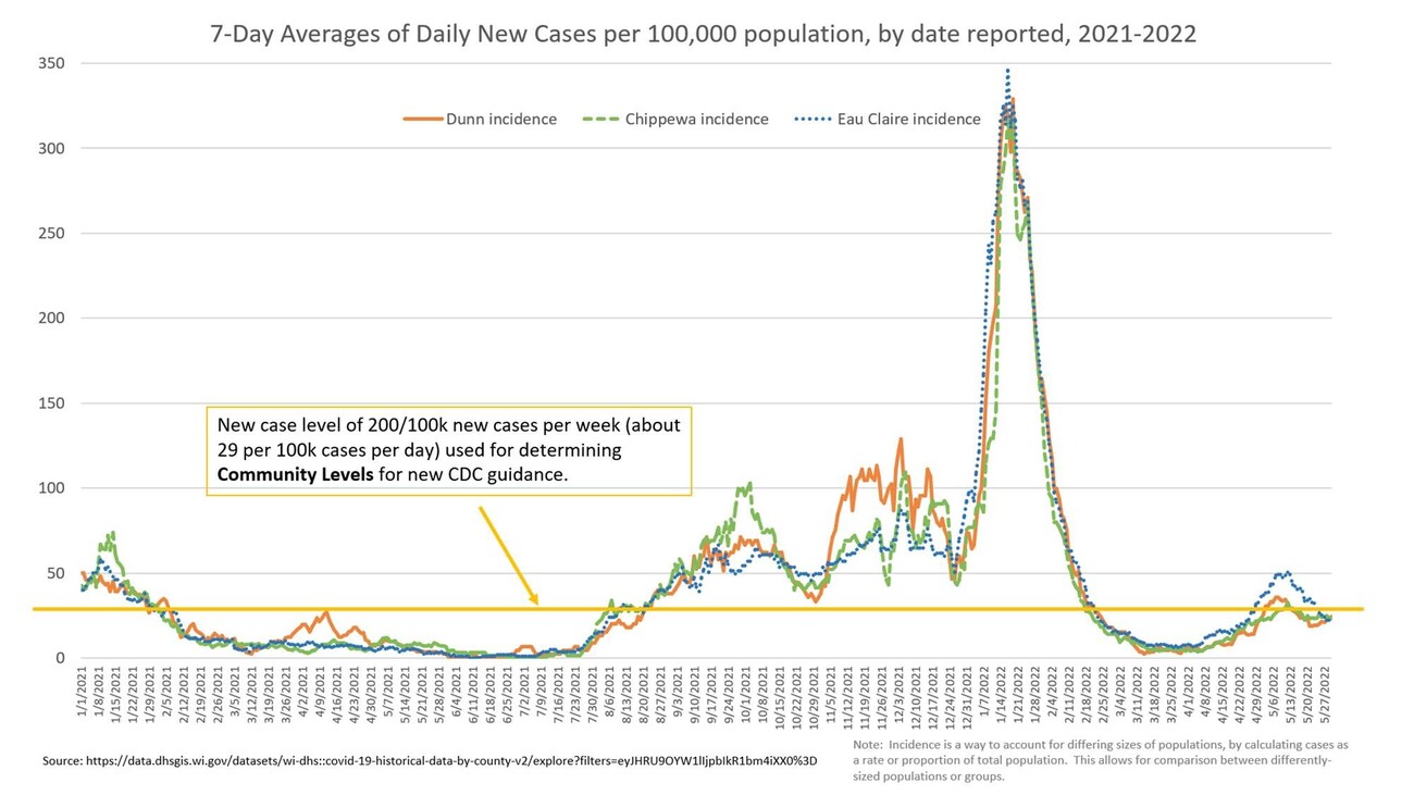 Weekly update - reported case rates are pretty stable as are hospitalizations. Keep in mind, transmission rate is still HIGH. Community Level is LOW. This means that although there is a lot of COVID going around (hence you should take precautions if you don't want to get it), it is not causing high levels of severe illness that are overwhelming our hospitals and medical capacity. The state of WI is currently averaging about 2200 reported cases per day, which is on par with what we saw during parts of the Delta wave. There is still a LOT of COVID going around. In fact, we think that there currently about 10-30x as many cases happening as are reported, due to people not getting tested and/or not reporting a positive home test. That would put this surge on par with the winter Omicron one. The good news is that hospitalizations, while still happening (some people are still getting quite ill), the rate is far lower than we've seen in previous surges. This is due to the less severe variant, the availability of treatments, and people's immunity due to vaccination, boosting, and prior infection. Our current cases are mostly BA.2 and it's new subvariant BA.2.12.1. There are two new subvariants of Omicron making their entrance, BA.4 and BA.5, which have just started to get a toe-hold in WI and will likely become our new dominant strains. In some countries, but not in others, these are associated with higher hospitalization rates. We shall see what happens here. What we do know is that they have a higher degree of immune escape, which is to say that previous infection with Omicron BA.1 or BA.2 is less protective against them than we would have hoped. So, if it's been 90 days or more since you've had a COVID infection, you absolutely could be getting it again with these new kids on the block. Please get tested if you are exposed or have any symptoms. So, overall, this pandemic is still going. For most people now with our current situation and especially if they are vaccinated and boosted, it is a mild to moderate flu-like illness. That's why CDC is no longer recommending universal masking - it's now rare that the illness is severe. BUT you can still get long-COVID (less likely if you're vaccinated, but happens) and we still have requirements for isolation if you are infected. So, if you don't want to get infected, please take precautions, especially in high-risk situations.