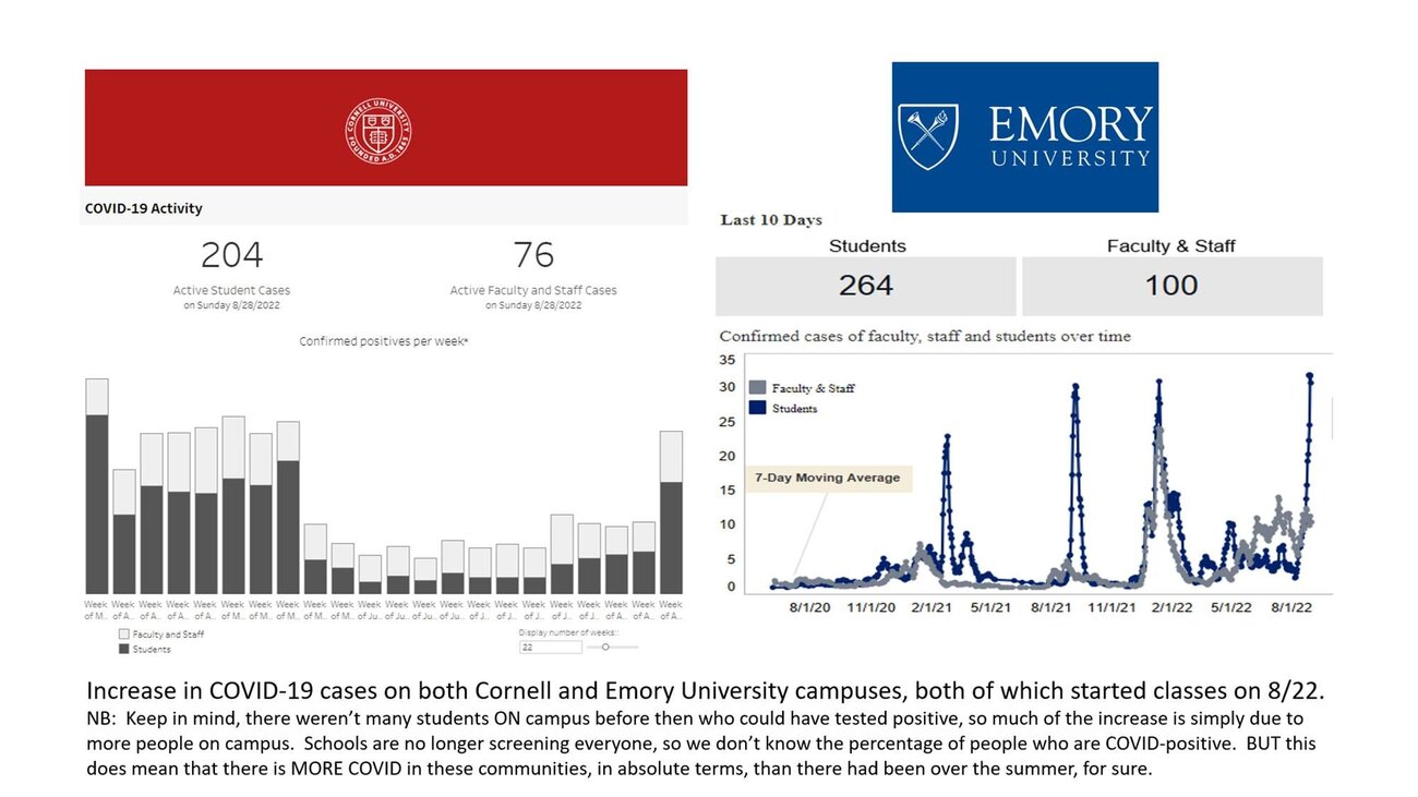 Weekly data update for Dunn County - holding steady at high transmission, Community Level back to Green/Low as hospitalizations have come back down. Things in the Chippewa Valley continue to move along, with lots of cases occurring. (How many friends do YOU know who've had COVID this past month? I'll bet it's quite a few. It's almost all BA.5, which is not surprising. Some people are still getting severely ill, but it is much less common than earlier in the pandemic. The big question is what will happen when school starts this week for K-12 and next week for our college campuses. Any time that groups of people who weren't associating with one another then come in contact, we see increased transmission of communicable diseases. COVID will not be any different. So, get ready. Expect increased transmission for at least the first few weeks. It will likely (I hope) then settle down due to the high levels of immunity, as the virus burns through those whose immunity hasn't been recently topped off. The alternative is that it sets off a bigger surge. I'm hoping that doesn't happen. We can see case increases happening in universities a week after they resumed classes - I've included graphs from both Cornell and Emory Universities, as they are some of the few who still collect and publish this information in this format. They're a few weeks ahead of us, so watching what happens there might be a useful indicator. Again, if now is not a good time for you to get sick (and back to school time rarely is for anyone), please consider upping your mitigation measures, especially in higher risk situations. Yesterday, I attended a crowded all-staff meeting with over 600 attendees in the same room for an hour. I wore a good mask. Also, expect teachers and students to get COVID and need to be absent/isolate in the first few weeks. We're in this weird situation where we allow for rampant transmission as long as hospital capacity is ok, and yet still require infected people to isolate for a minimum of 5 days regardless of medical capacity. It's disjointed. But it's what we have. If you're a school administrator, be prepared with subs. If you're a parent, be prepared with back-up child care if your child needs to stay home to isolate. Better to be prepared and not need it than be caught in a bind. For those of you who set workplace policy, it's probable that our case counts will push us into the Orange/High Community Level at some point in the next month, at which time universal masking is recommended, so keep an eye on that. The good news is that close contacts do not need to quarantine, but they ARE supposed to wear a mask for at least 5 days and test on day 5 or sooner if they develop symptoms. If you have symptoms and test negative, repeat the test in 48 hours to be sure, as false negatives do occur early in the illness with Omicron. Lastly, this Friday is the last day to order your free at-home COVID tests from covid.gov. Get them now if you haven't already!