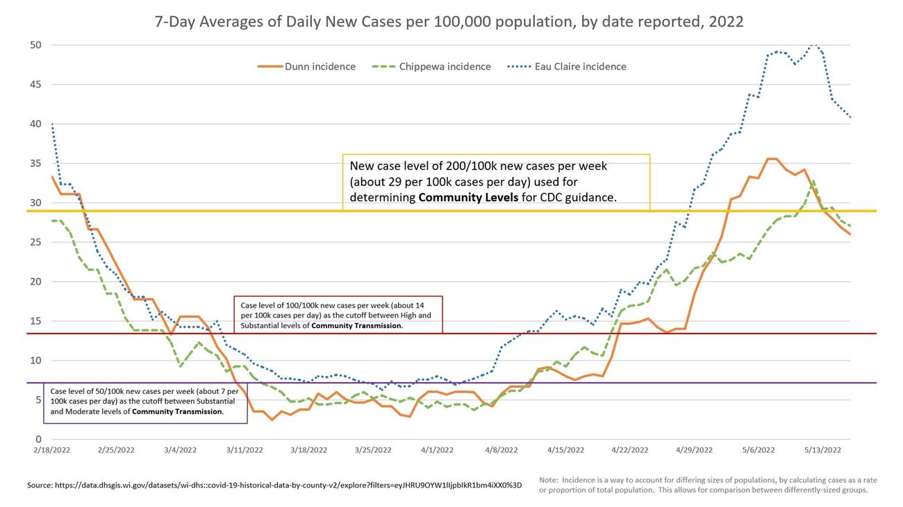Weekly update - a potential leveling. Cases in the Chippewa Valley, and indeed the state and region, appear to have leveled off a bit. Whether this is a true phenomenon or due to less testing by college campuses (most of whom have completed their semesters and closed their testing centers) remains to be seen. For now we are still at a Medium Community Level (Yellow) - that could potentially change in the next week or two if cases decline and hospitalizations stay low. Transmission risk continues to be high, as in if you go to lots of crowded indoor places and don't mask, you are fairly likely to get infected. I chose to take that risk attending a local theater this past weekend, as a vaccinated and boosted low-risk person who has no big special events coming up or vulnerable persons with whom I regularly interact. We'll see if I end up regretting taking that risk or not. Again, COVID now is different from COVID a year ago. Vaccines and boosters and natural infection plus a less virulent (severe) variant mean that, although cases (and hospitalizations) are going up, hospitalizations are not going up at the same proportion they used to, and in particular, ICU patients and deaths are not going up at nearly the same proportion. Is COVID still potentially fatal? Yes, just much less commonly so. How does the current severity compare to influenza? In a bad flu season, there are about 50,000 U.S. deaths, but the typical range is from 12k-52k. In the past month, there have been about 11,000 deaths from COVID in the U.S. A typical flu season lasts several months, so we're currently about on par with a moderate to bad flu season. Death is not the only outcome that matters, of course. Getting sick is no fun, nor are the post-infectious complications that we're seeing with COVID. But right now, at the moment, we're similar to a bad flu season. If cases rise significantly, that will be a different story. Hopefully, however, with the warmer weather, this surge may start to turn around soon.