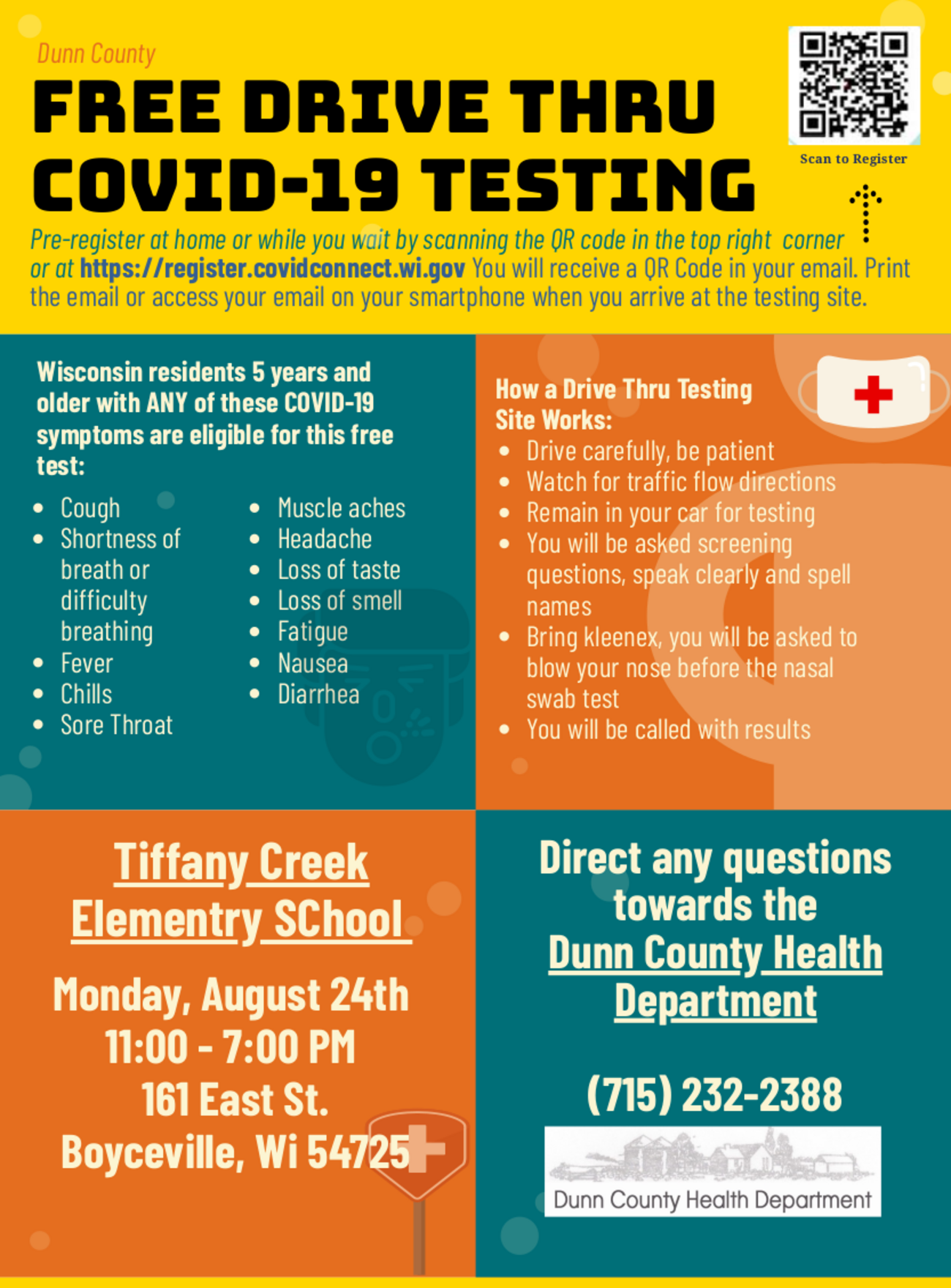 The testing site will be at Tiffany Creek Elementary School, 161 East St, Boyceville, WI. The event will run from