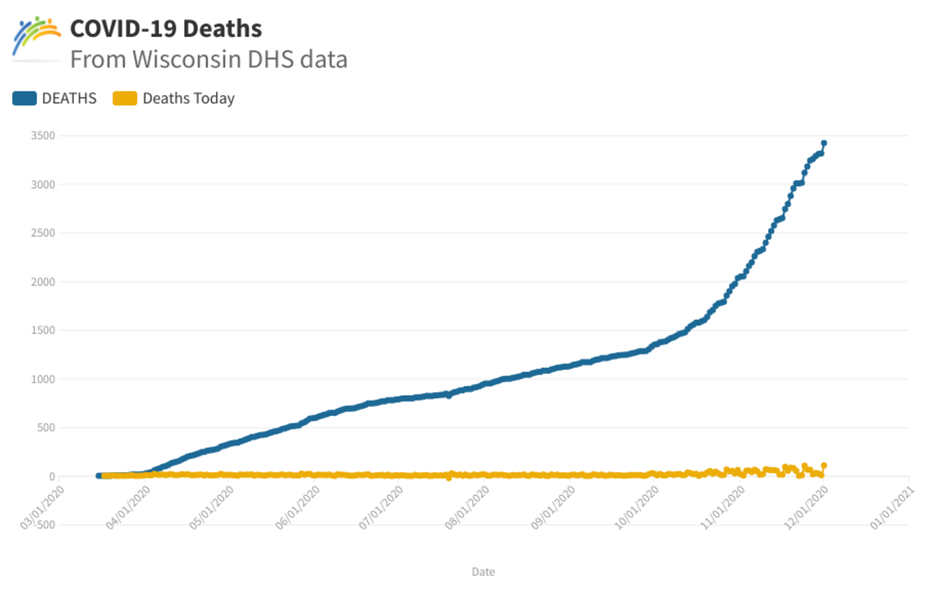 107 deaths were reported today in Wisconsin from COVID-19. It is entirely possible that part of that sudden spike was caused by a lag in reporting over the holiday weekend, but it is clear we are still suffering badly from the pandemic.