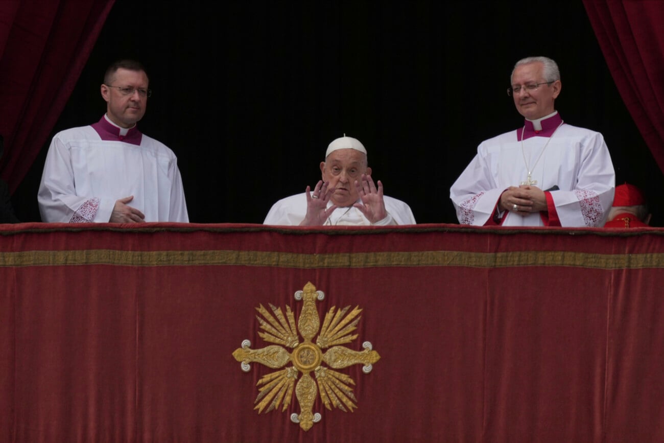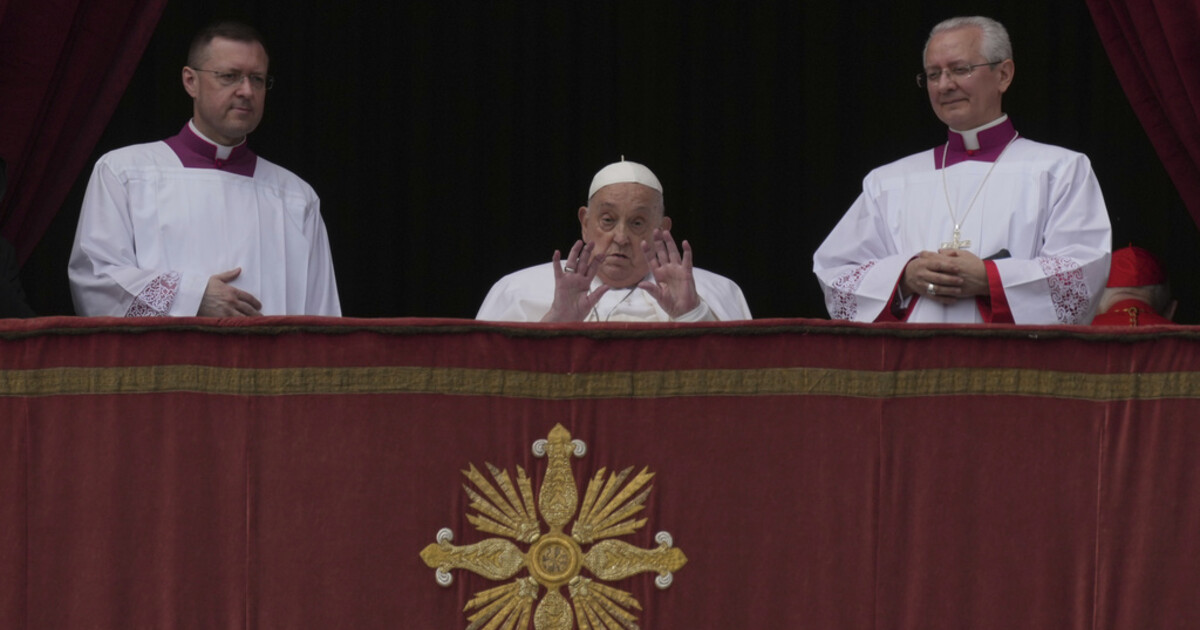 Pope Francis appears on the central lodge of St. Peter's Basilica to bestow the Urbi et Orbi (Latin for to the city and to the world) blessing at the end of the Easter mass presided over by Cardinal Angelo Comastri in St. Peter's Square at the Vatican Sunday, April 20, 2025.(AP Photo/Andrew Medichini)