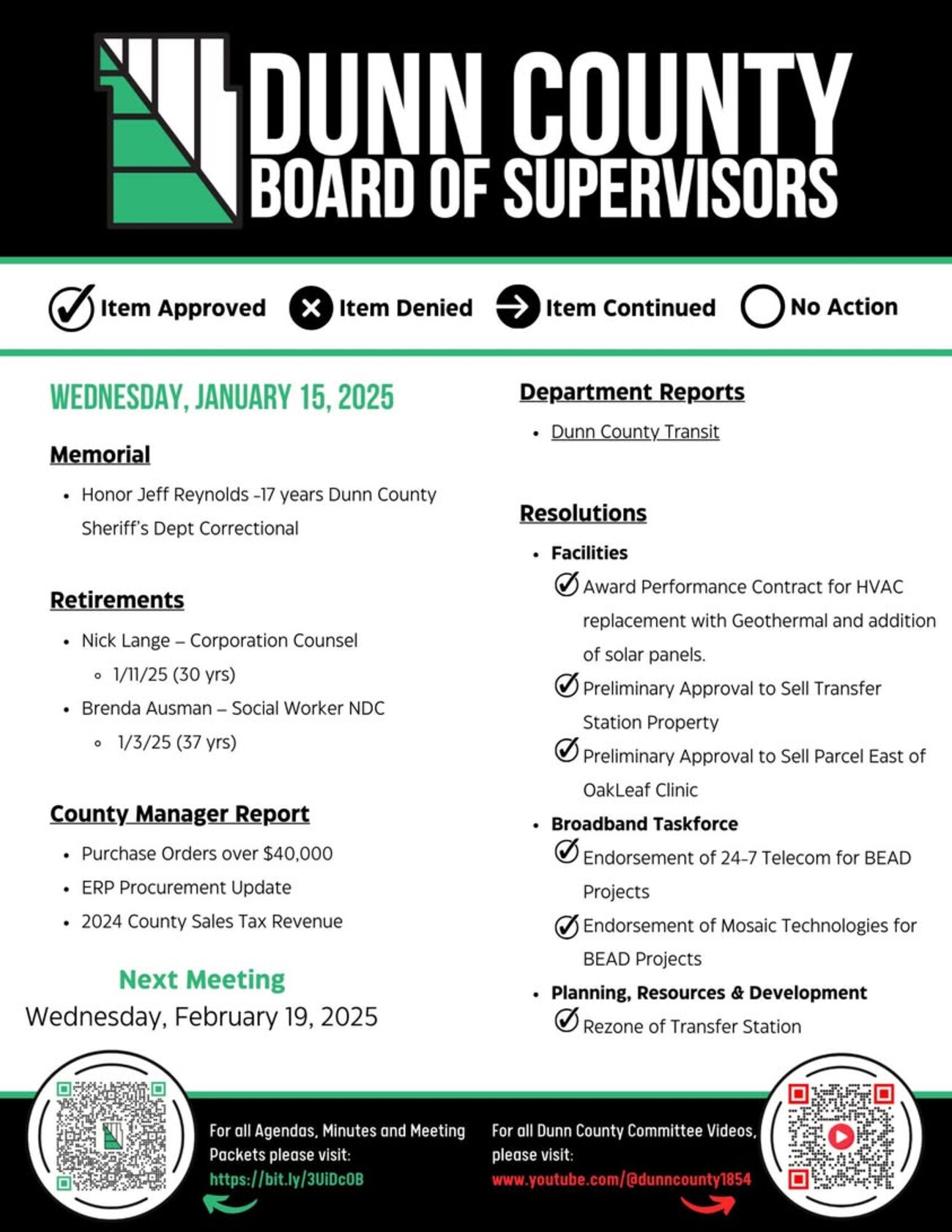 A video recording of the meeting will be available for subsequent viewing on the Dunn County YouTube channel at the following link: https://www.youtube.com/@dunncounty1854.