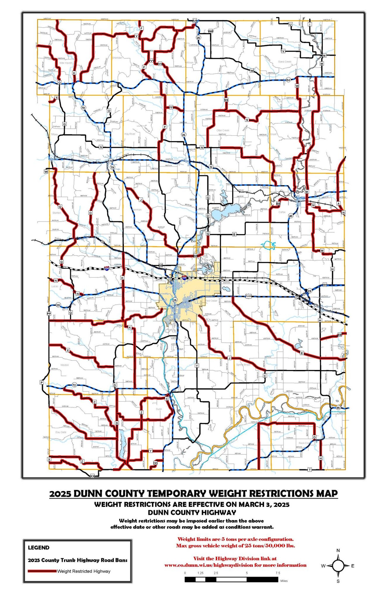 The Dunn County Highway Department is implementing temporary weight restrictions effective on Monday March 3, 2025. Based on road conditions, weight restrictions can be imposed earlier than the above effective date or additional roads may be added at any time.