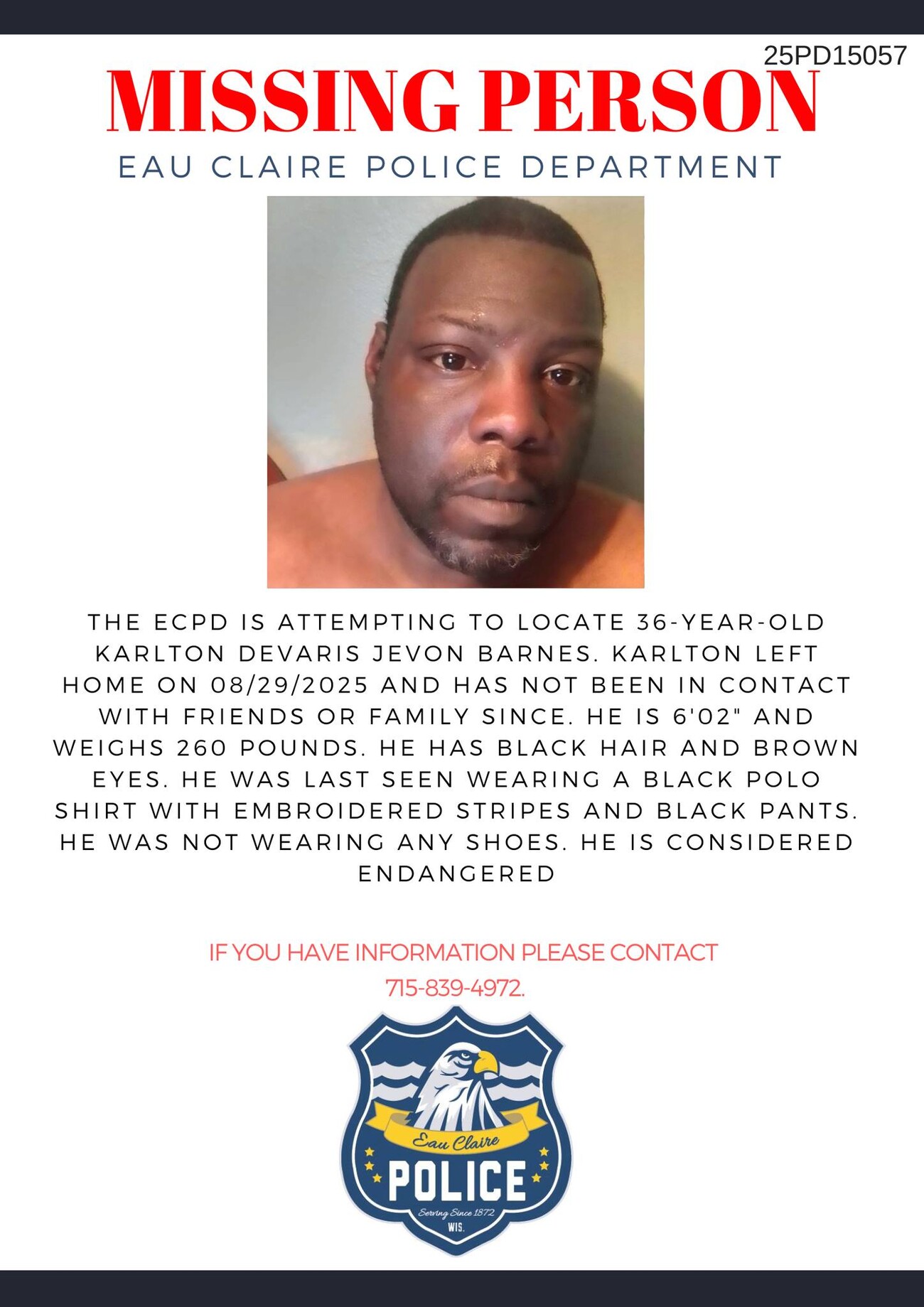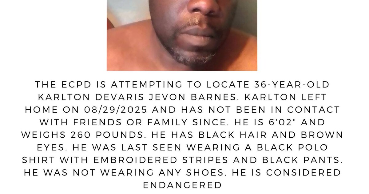 The ECPD is attempting to locate 36-year-old Karlton Devaris Jevon Barnes. Karlton left home on 08/29/2025 and has not been in contact with friends or family since. He is 6'02" and weighs 260 pounds. He has black hair and brown eyes. He was last seen wearing a black polo shirt with embroidered stripes and black pants. He was not wearing any shoes. He is considered endangered.