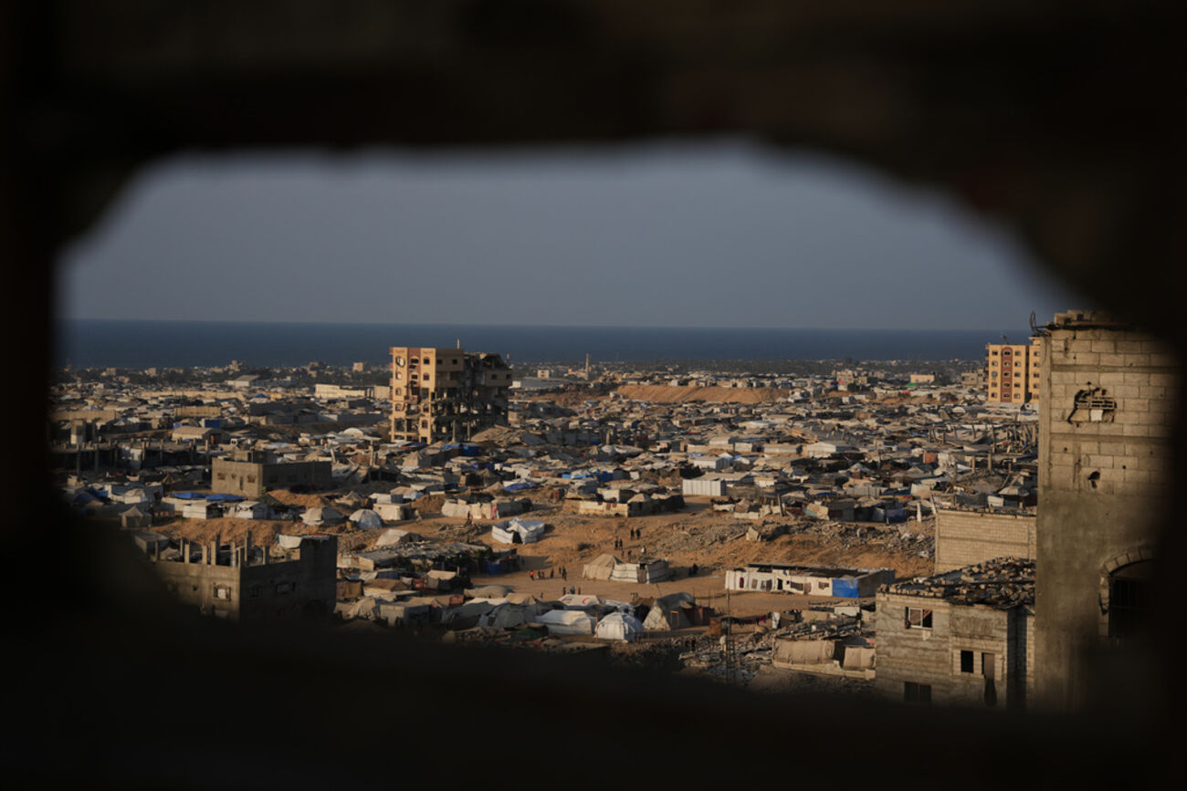 A tent camp for displaced Palestinians stretches amid the ruins of destroyed buildings in Khan Younis, in the southern Gaza Strip, Saturday, Nov. 8, 2025. (AP Photo/Abdel Kareem Hana)