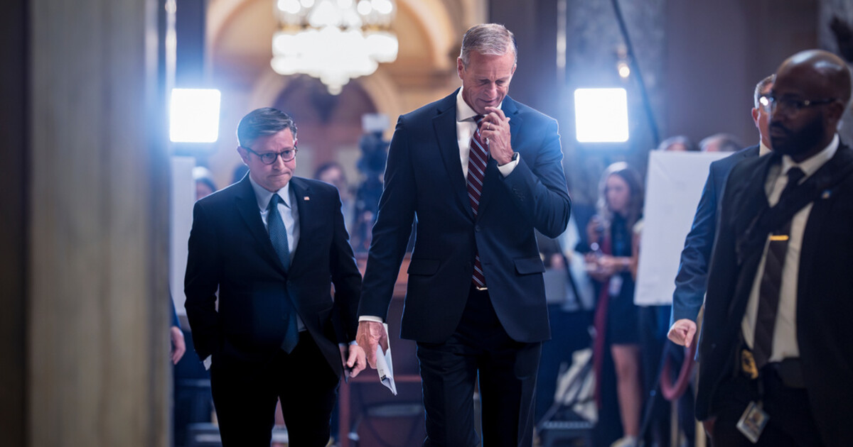 Speaker of the House Mike Johnson, R-La., left, and Senate Majority Leader John Thune, R-S.D., return to their offices after meeting with reporters on the third day of the government shutdown, at the Capitol in Washington, Friday, Oct. 3, 2025. (AP Photo/J. Scott Applewhite)