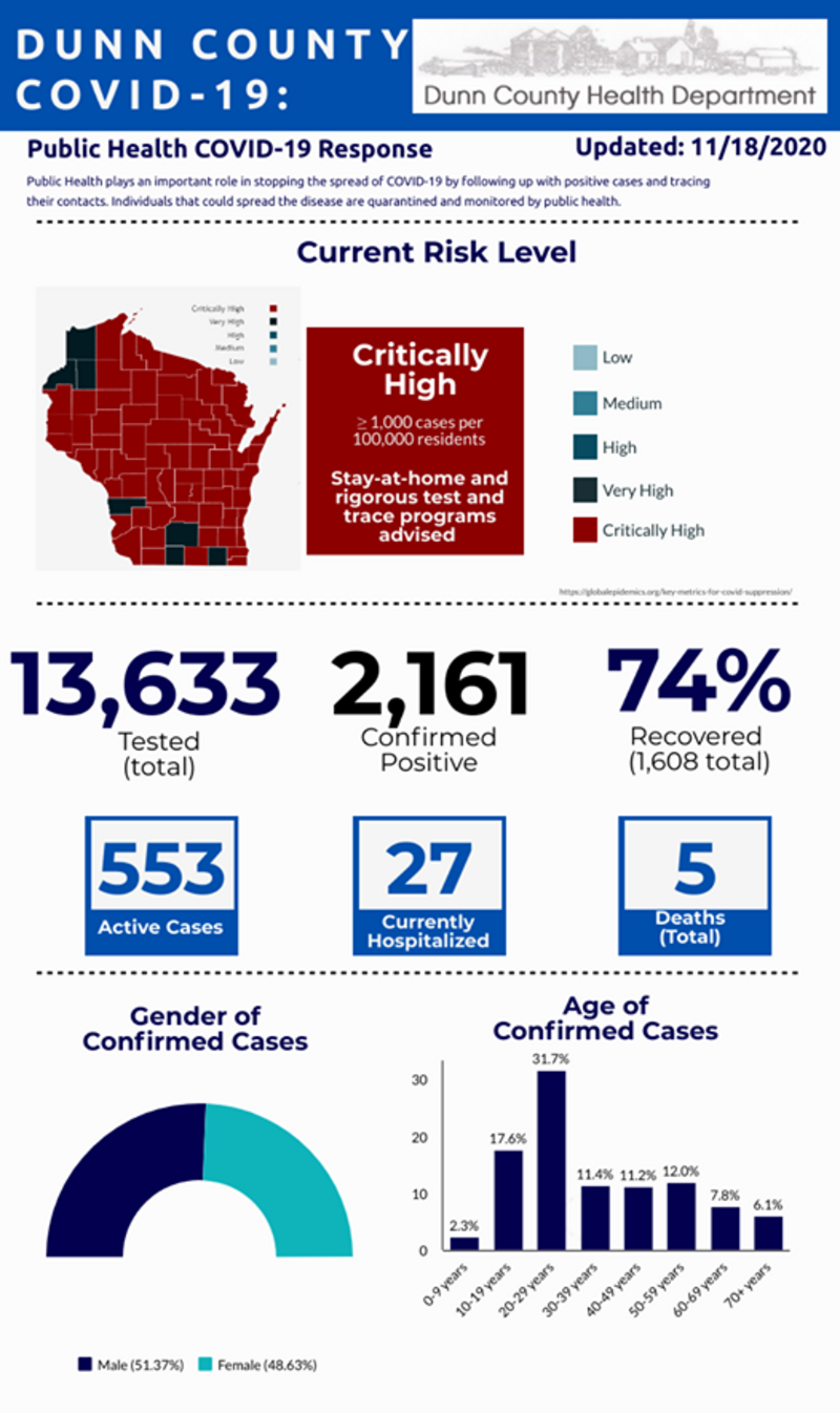 Local hospitals are now very stressed, as are others in the state. Many of them are now in their surge plan. Because the county is so heavily overwhelmed they have had to re-think contact tracing again, and are asking all non-household contacts to be traced directly, rather than through the health department. They are now dealing with approximately six times the number of cases they can handle well. KT Gallagher has hired four new contact tracers in the last week, so they now have 22 plus the 13 being employed by UW-Stout. "To say that COVID is consuming the health department is an understatement" according to Gallagher.