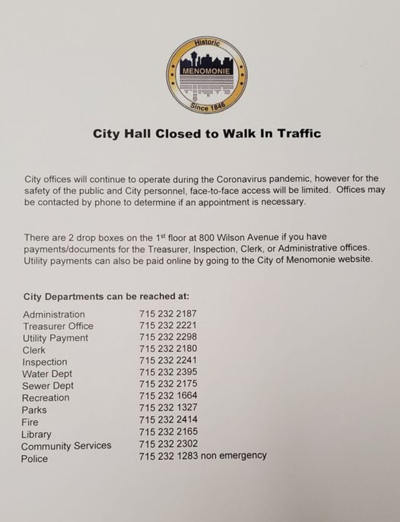 The City of Menomonie has announced that city offices will be closed to the public for most purposes starting today, Monday, Nov. 9. The closing is part of an attempt to mitigate the spread of the pandemic. Offices will continue to operate but will be closed for most face-to-face contact unless an appointment is made. Phone numbers for the city departments are listed in the graphic above, or may be found at the city's website.
