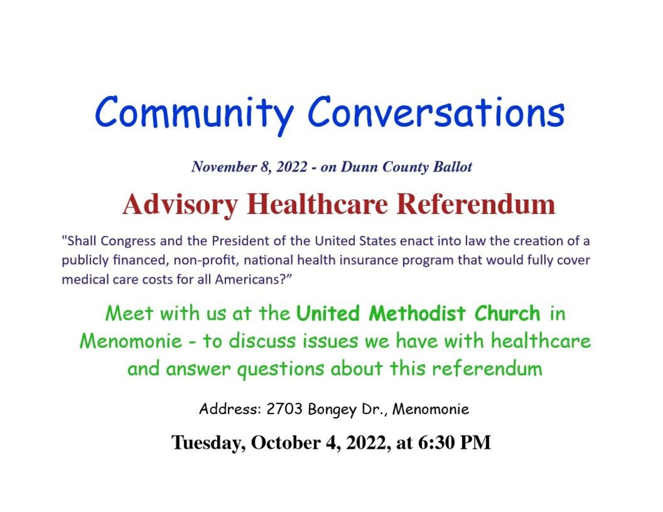There will be a Community Conversations meeting on Tuesday, Oct. 4 at 6:30 PM to discuss the upcoming Heath Care Referendum in Dunn County. The meeting will take place at United Methodist Church, 2703 Bongey Dr., Menomonie, WI.