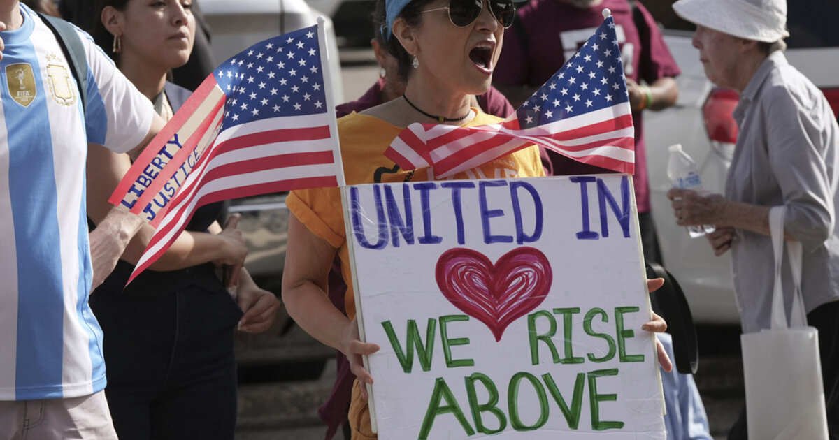 Immigration advocates protest recent detentions by ICE outside the immigration court in San Antonio, Texas, Tuesday, July 1, 2025. (AP Photo/Eric Gay)
