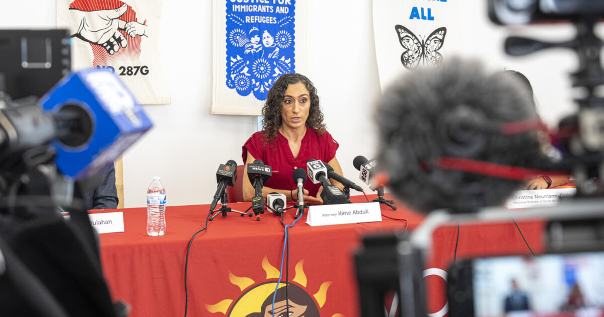 Kime Abduli, Ramon Morales Reyes' attorney addresses the media Friday, May 30, 2025 in Milwaukee about the detention of her client Ramon Morales Reyes. (AP Photo/Andy Manis)
