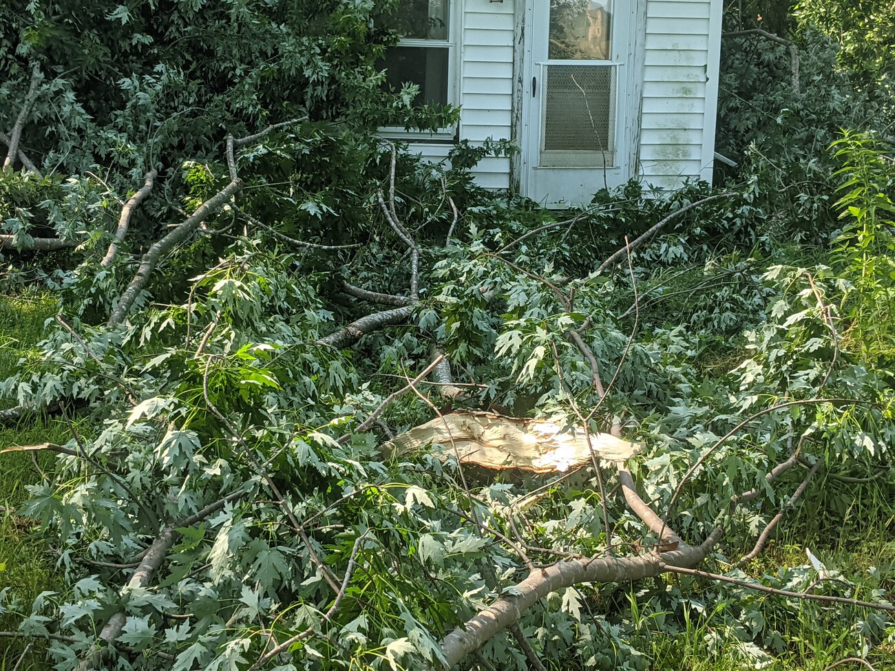 I got up this morning to find my Downsville area front yard full of tree branches. I am currently trying to figure out the best way to deal with this, but it can wait till the heat advisory ends. Fortunately, the only damage to my house was that one of the branches broke my pellet stove vent, though it looks like that will be easy to repair.