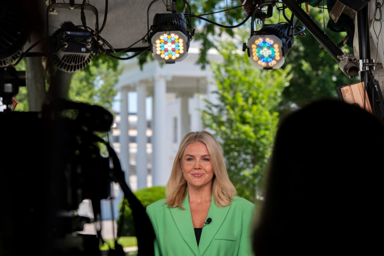 White House press secretary Karoline Leavitt does a television interview at the White House, Monday, June 2, 2025, in Washington. (AP Photo/Alex Brandon)