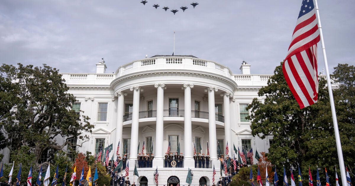 Military jets fly over the White House as President Donald Trump welcomes Saudi Arabia's Crown Prince Mohammed bin Salman, Tuesday, Nov. 18, 2025, in Washington. (AP Photo/Mark Schiefelbein)