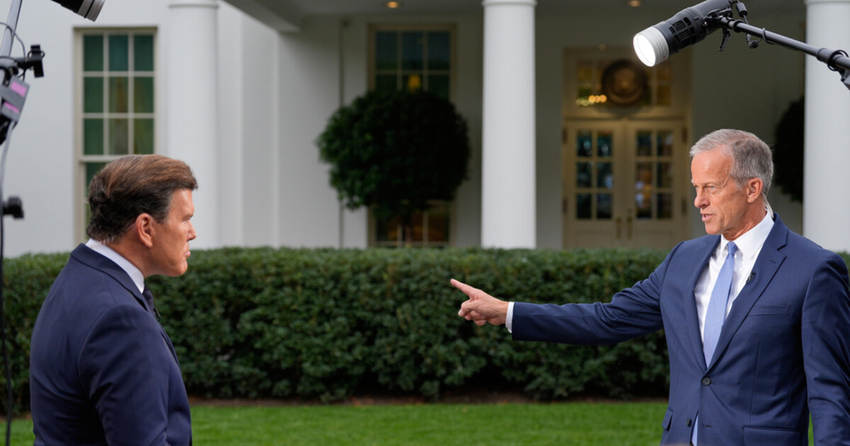 Senate Majority Leader John Thune, R-S.D., is interviewed by FOX News Channel's Bret Baier outside the West Wing of the White House, Monday, Sept. 29, 2025, in Washington. (AP Photo/Alex Brandon)