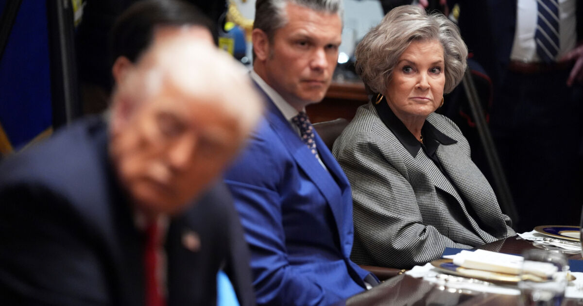 White House Chief of Staff Susie Wiles, from right, and Defense Secretary Pete Hegseth listen as President Donald Trump meets with Australian Prime Minister Anthony Albanese, not pictured, in the Cabinet Room of the White House, Monday, October 20, 2025, in Washington. (AP Photo/Evan Vucci)