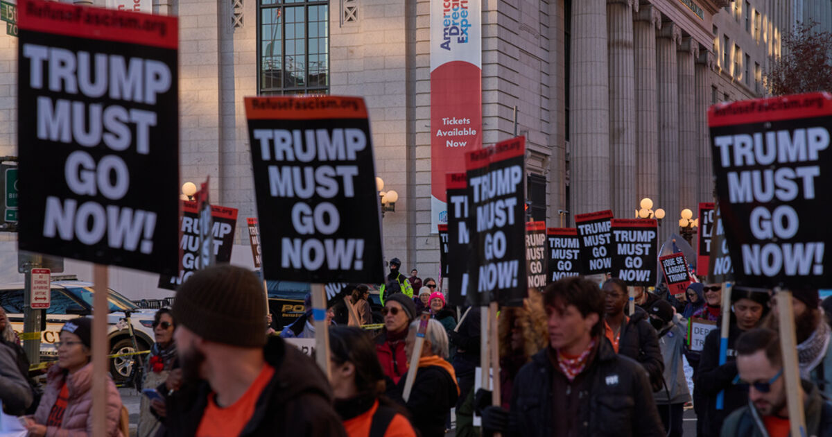 Protesters march past the Milken Center for Advancing the American Dream, during a "Trump Must Go Now!" rally by the White House, Monday, Nov. 17, 2025, in Washington. (AP Photo/Jacquelyn Martin)