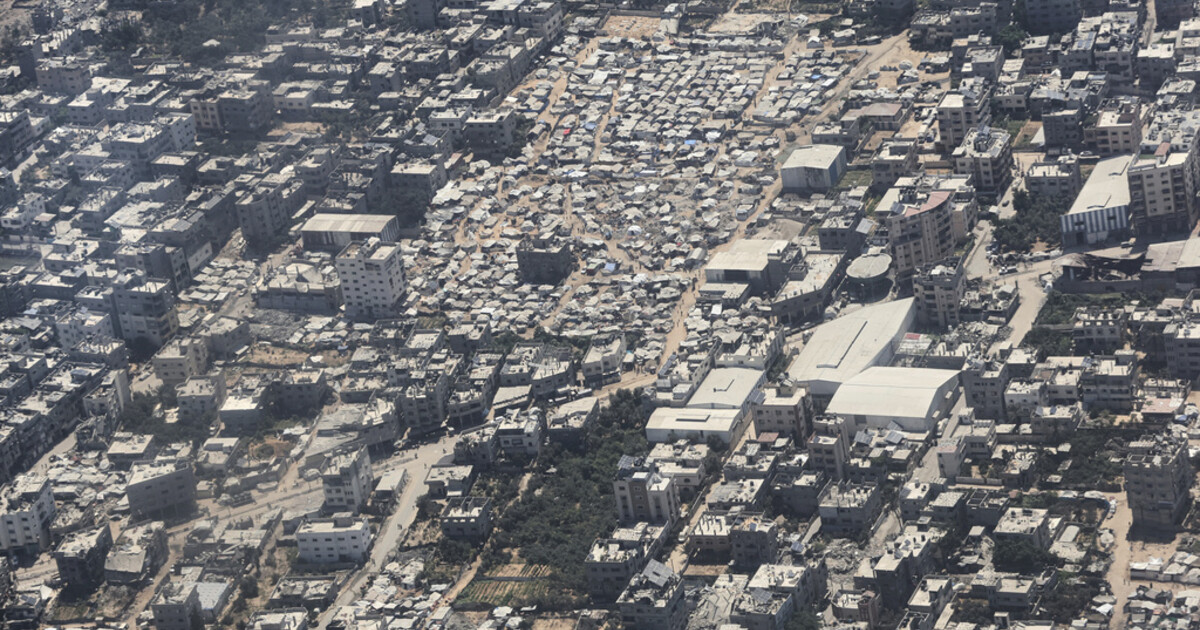 A tent camp in Gaza City is seen from a Jordanian Air Force C-130 plane during an airdrop of humanitarian aid for Palestinians on the Gaza Strip, Thursday, Aug. 7, 2025. (AP Photo/Raad Adayleh)