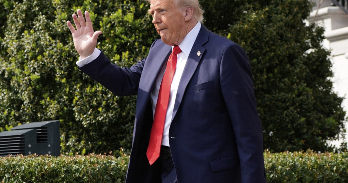 President Donald Trump waves as he departs after welcoming the 2025 College Football National Champions, the Ohio State University football team, during an event on the South Lawn of the White House, Monday, April 14, 2025, in Washington. (AP Photo/Alex Brandon)