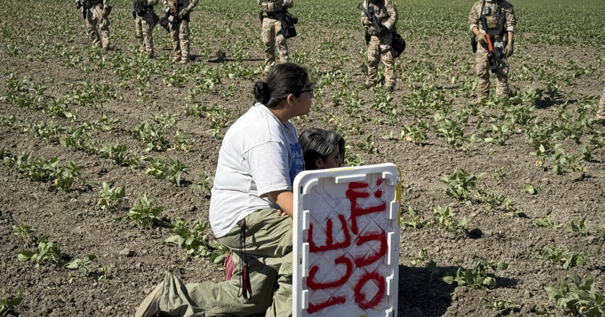 FILE - A demonstrator kneels in front of federal agents in a farm field during an immigration raid in Camarillo, Calif., Thursday, July 10, 2025. (AP Photo/Michael Owen Baker, File)
