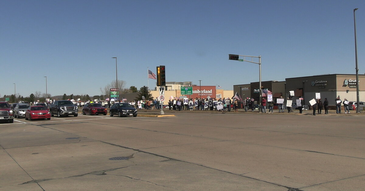 Between 200 and 250 people lined North Broadway near the interstate on Saturday afternoon to join the nationwide April 5 Hands Off Protest. In the breezy, brisk weather, protesters held signs demanding the government keep Medicare and Medicaid benefits, and protesting the Trump administration and Elon Musks involvement in DOGE.