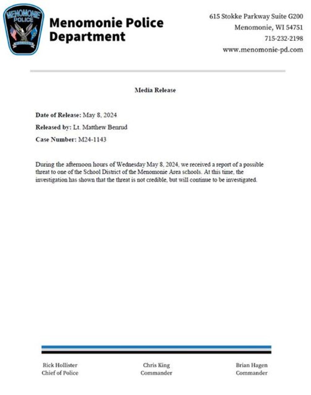 According to a press release from the Menomonie Police Department, a threat was received during business hours on Wednesday, May 8 against one of the Menomonie Schools. The report was investigated and found to not be credible. An investigation continues.