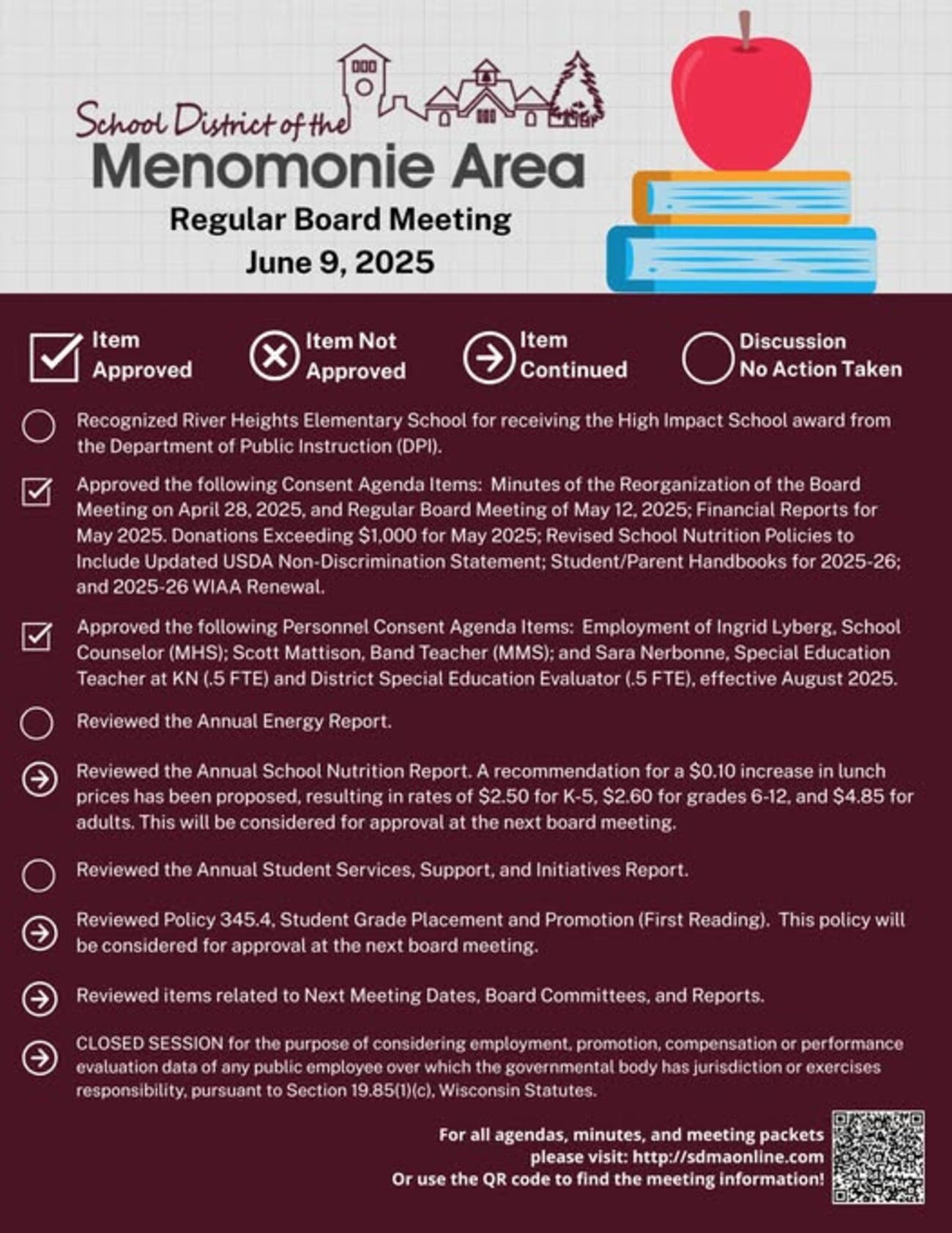 • $26,000.00 donation to MHS Athletics from Menomonie Booster Club Association.