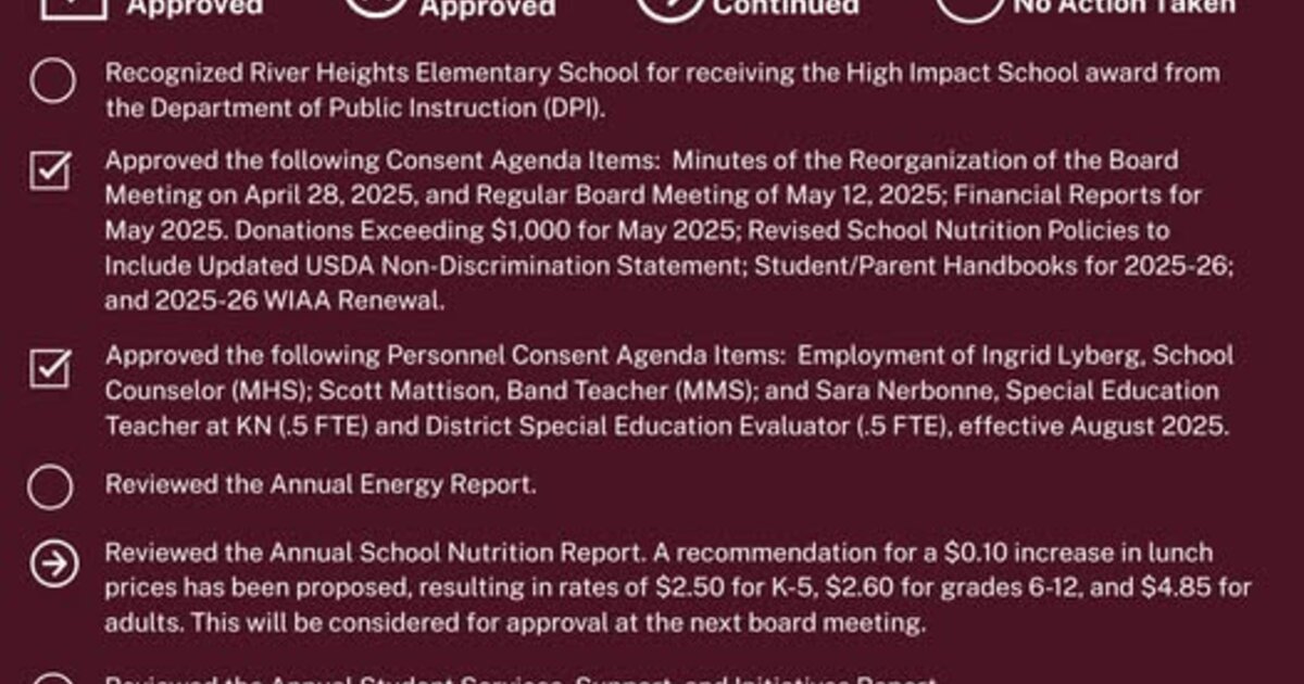 Recommendations for Regular Board Meeting on June 9, 2025: