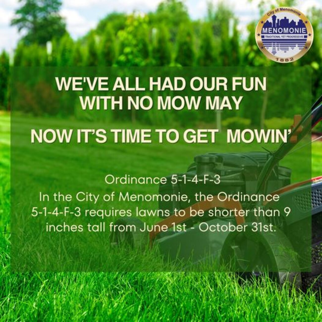 This is a quick reminder from the City of Menomonie that No Mow May has ended and all lawns in the city must be kept to a height of less than 9 inches until October 31st.