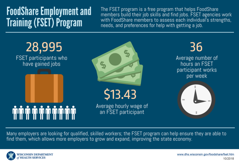 FoodShare Employment and Training, commonly known as FSET, is the primary workforce training program that FoodShare members take part in to meet the work requirement. Created in 2008, the program is free for FoodShare recipients, and data from the Wisconsin Department of Health Services show that more than 30,000 participants have secured employment between April 2015, when the work requirement was reinstated, and September 2018.