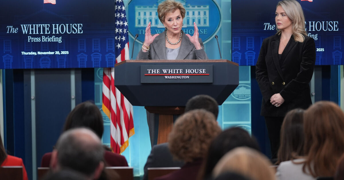 Education Secretary Linda McMahon speaks as White House press secretary Karoline Leavitt listens during a press briefing at the White House, Thursday, Nov. 20, 2025, in Washington. (AP Photo/Evan Vucci)