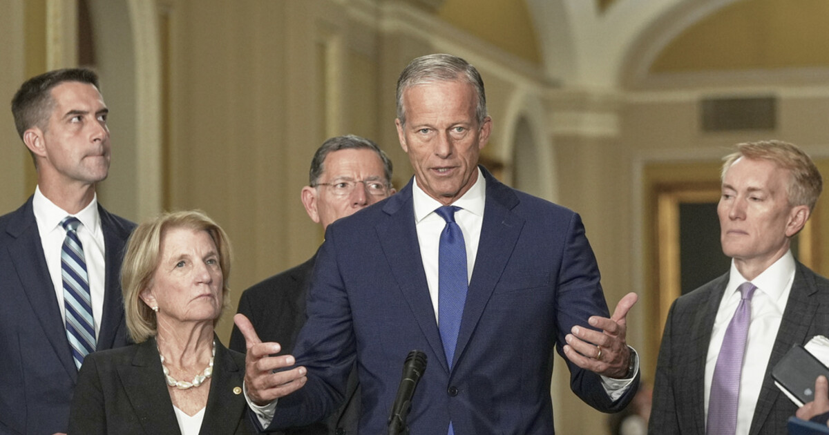 Sen. Majority Leader John Thune, R-S.D., center, speaks during a news conference after a policy luncheon at the Capitol Tuesday, July 29, 2025, in Washington. (AP Photo/Mariam Zuhaib)