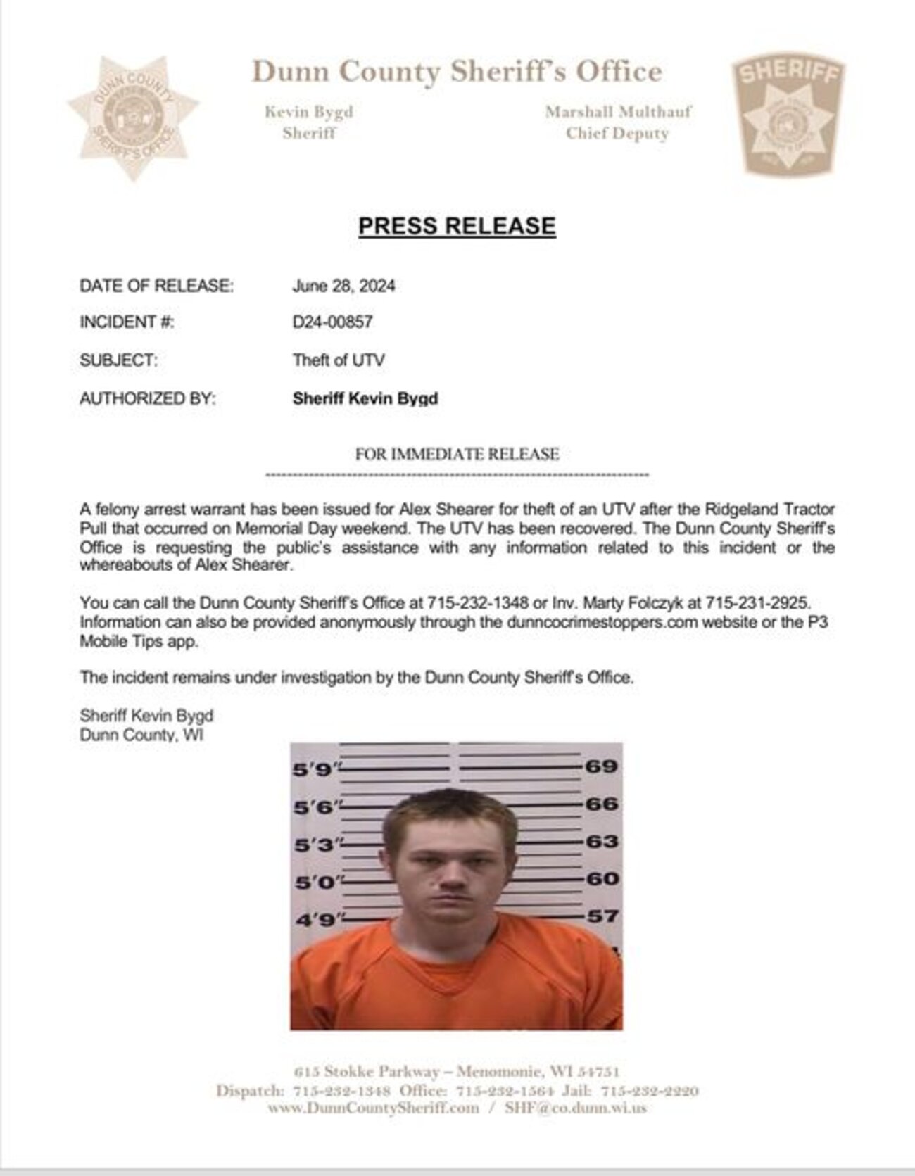 A felony arrest warrant has been issued for Alex Shearer, who is wanted for theft of an ATV from the Ridgeland Tractor Pull on Memorial Day weekend. If you have any information you may call the Sheriff's office at 715-232-1348 or contact Investigator Marty Folczyk at 715-231-2925.
