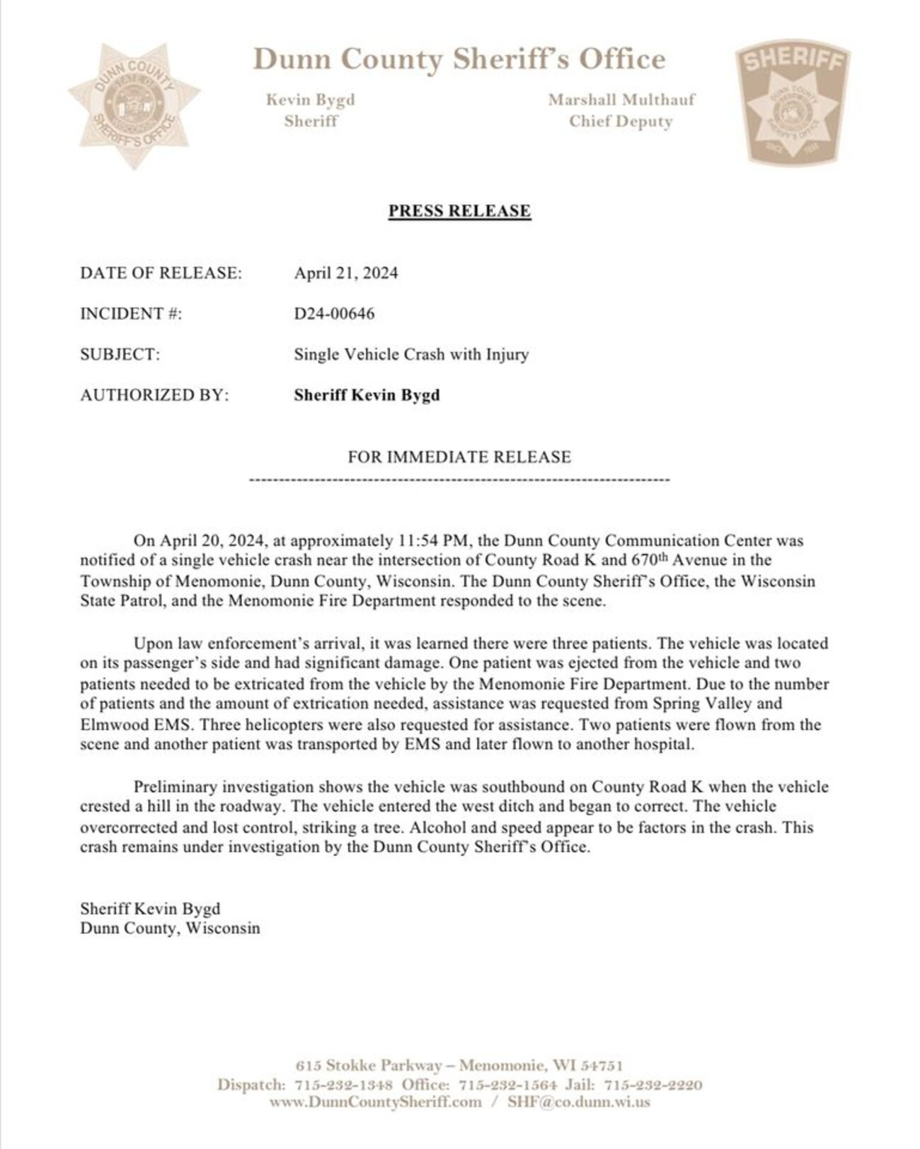 On April 20th at approximately 11:54 PM the Dunn County Sheriff's office responded to a call for an accident on Cty Trunk K and 670th Avenue in the Town of Menomonie. The Dunn County Sheriff's office, Wisconsin State Patrol, and Menomonie Fire Department responded to the scene.