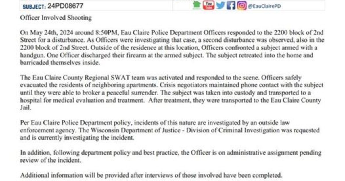 ON May 24 at approximately 8:50 PM Eau CLaire Police responded to a call. While on the call they observed a second disturbance in the 2200 block of 2nd Street. Officers observed a suspect with a handgun. An officer discharged their firearm at the suspect, who retreated into his home and barricaded himself inside.