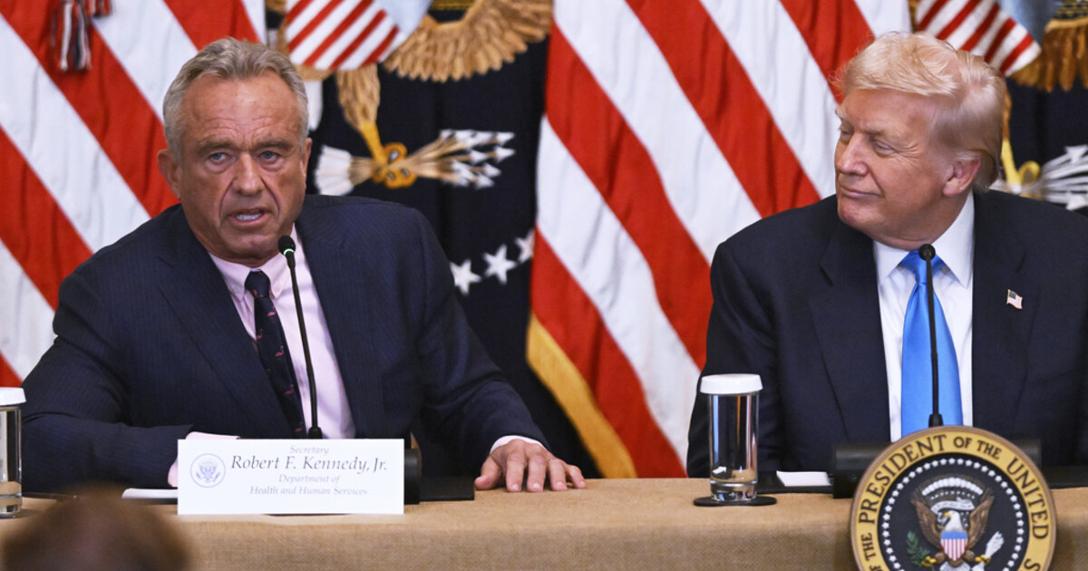 Health and Human Service Secretary Robert F. Kennedy, Jr., left, speaks at an event in the East Room of the White House, Wednesday, July 30, 2025, in Washington, as President Donald Trump, looks on. (AP Photo/John McDonnell)