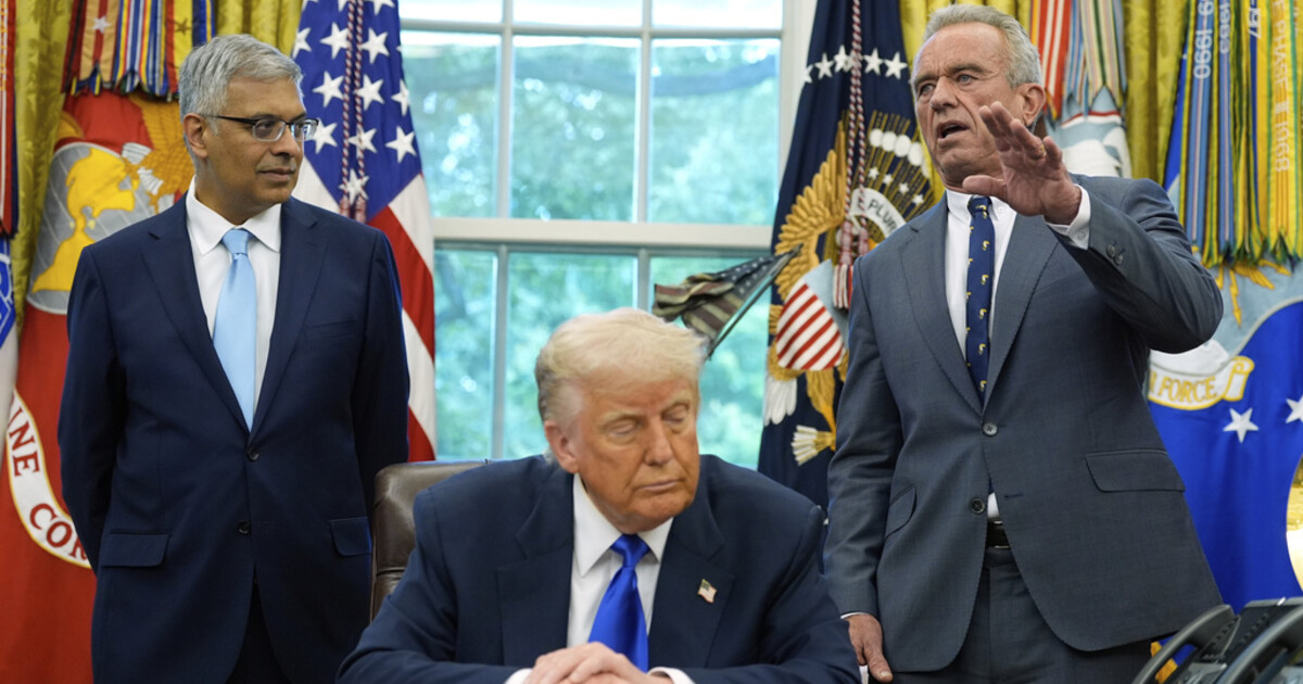 President Donald Trump listens as Health and Human Services Secretary Robert F. Kennedy Jr., speaks as he signs executive orders and proclamations in the Oval Office of the White House, Monday, May 5, 2025, in Washington. Jay Bhattacharya, director of the National Institutes of Health, listens at left. (AP Photo/Alex Brandon)