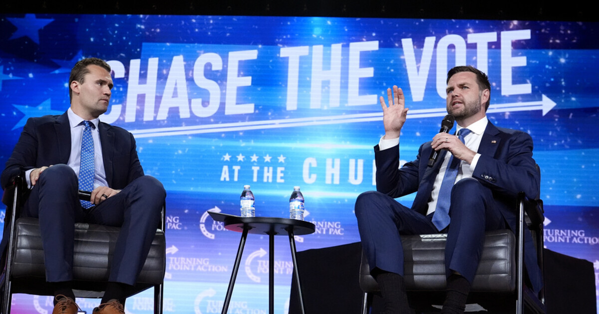 FILE - Republican vice presidential nominee Sen. JD Vance, R-Ohio, right, speaks at a campaign event as Turning Point USA Founder Charlie Kirk, left, listens, Wednesday, Sept. 4, 2024, in Mesa, Ariz. (AP Photo/Ross D. Franklin, File)