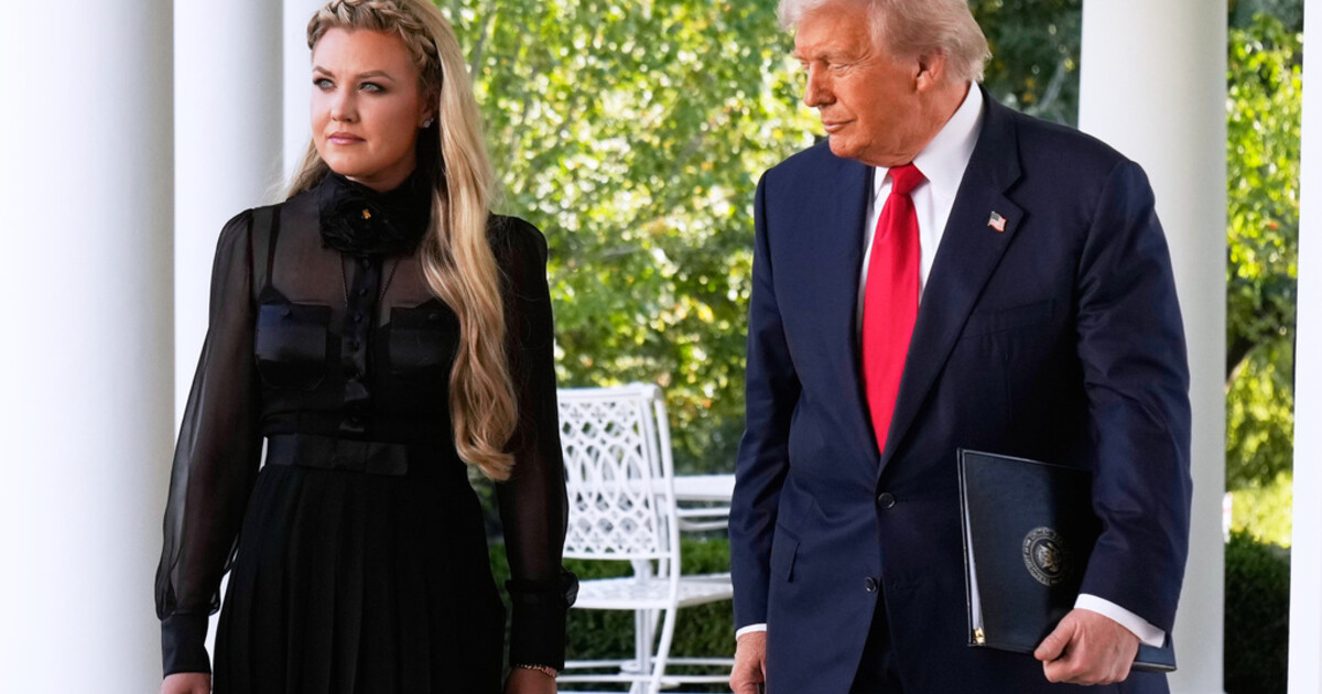 President Donald Trump, with Erika Kirk, walks out to present the Presidential Medal of Freedom for Charlie Kirk to his widow Erika Kirk, in the Rose Garden of the White House, Tuesday, Oct. 14, 2025, in Washington. (AP Photo/Mark Schiefelbein)
